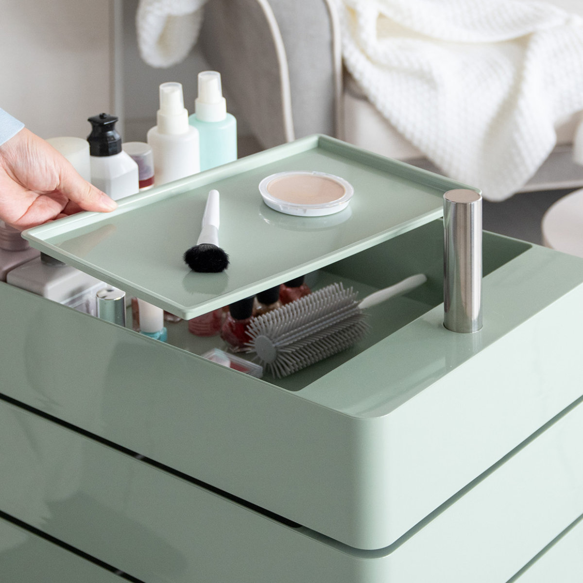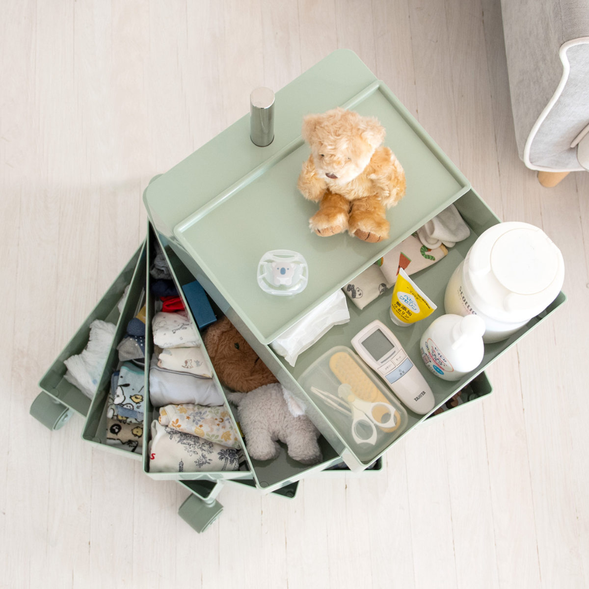 最上段は、簡単に取り外せる天板トレーのボックス仕様です。使用頻度の高い文房具や小物などの収納にぴったりです。メイク道具やベビー用品など、高さのあるボトルの収納にも◎