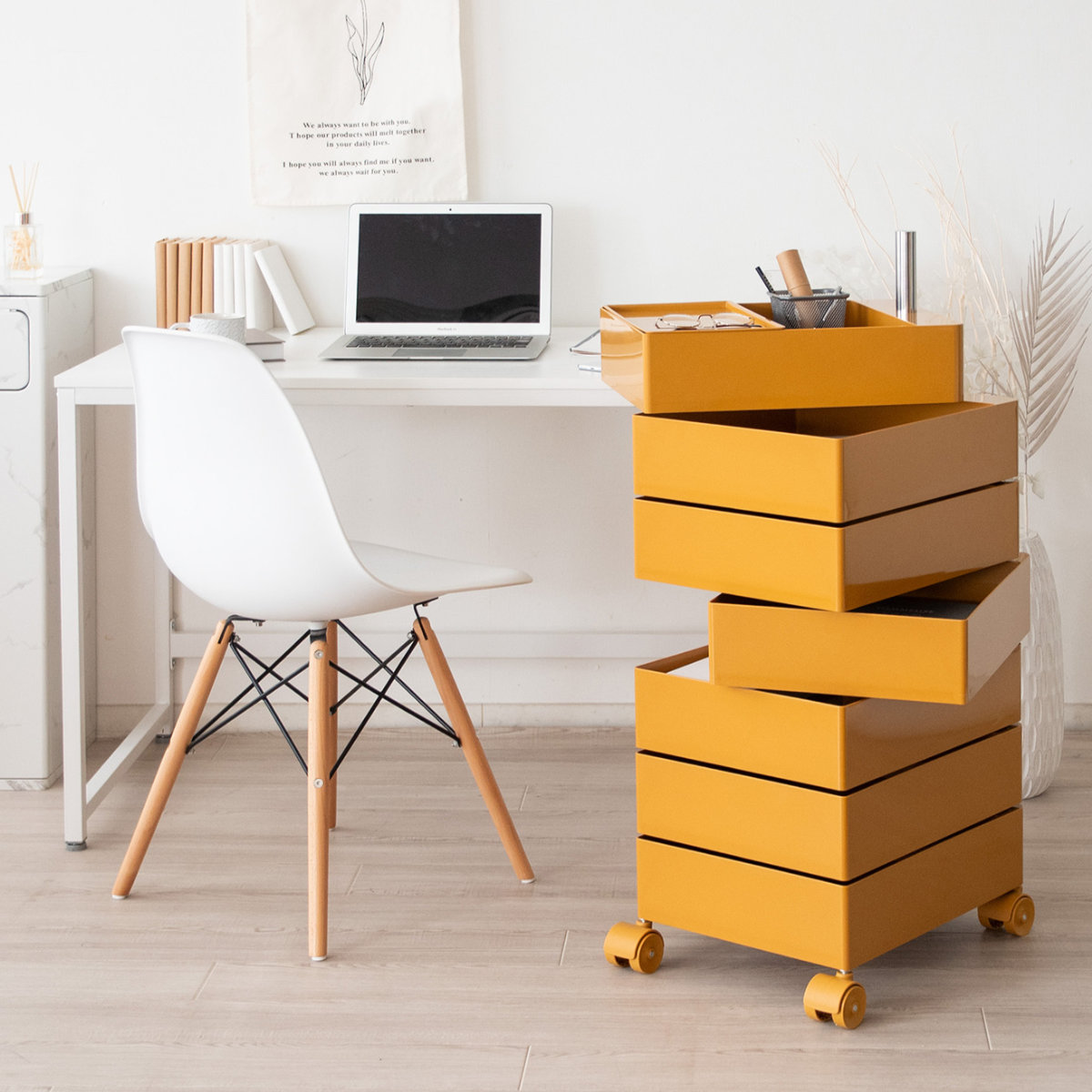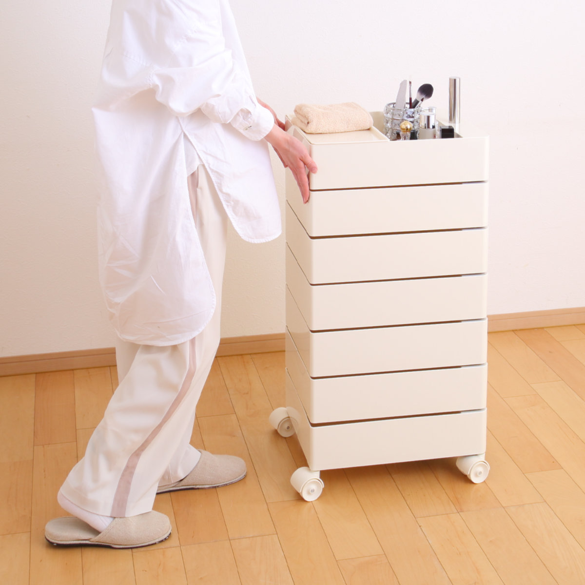ワゴンは面倒な組み立ての必要がない完成品です。キャスターを底部に取り付けるだけなので、届いたその日からすぐにお使いいただけます。