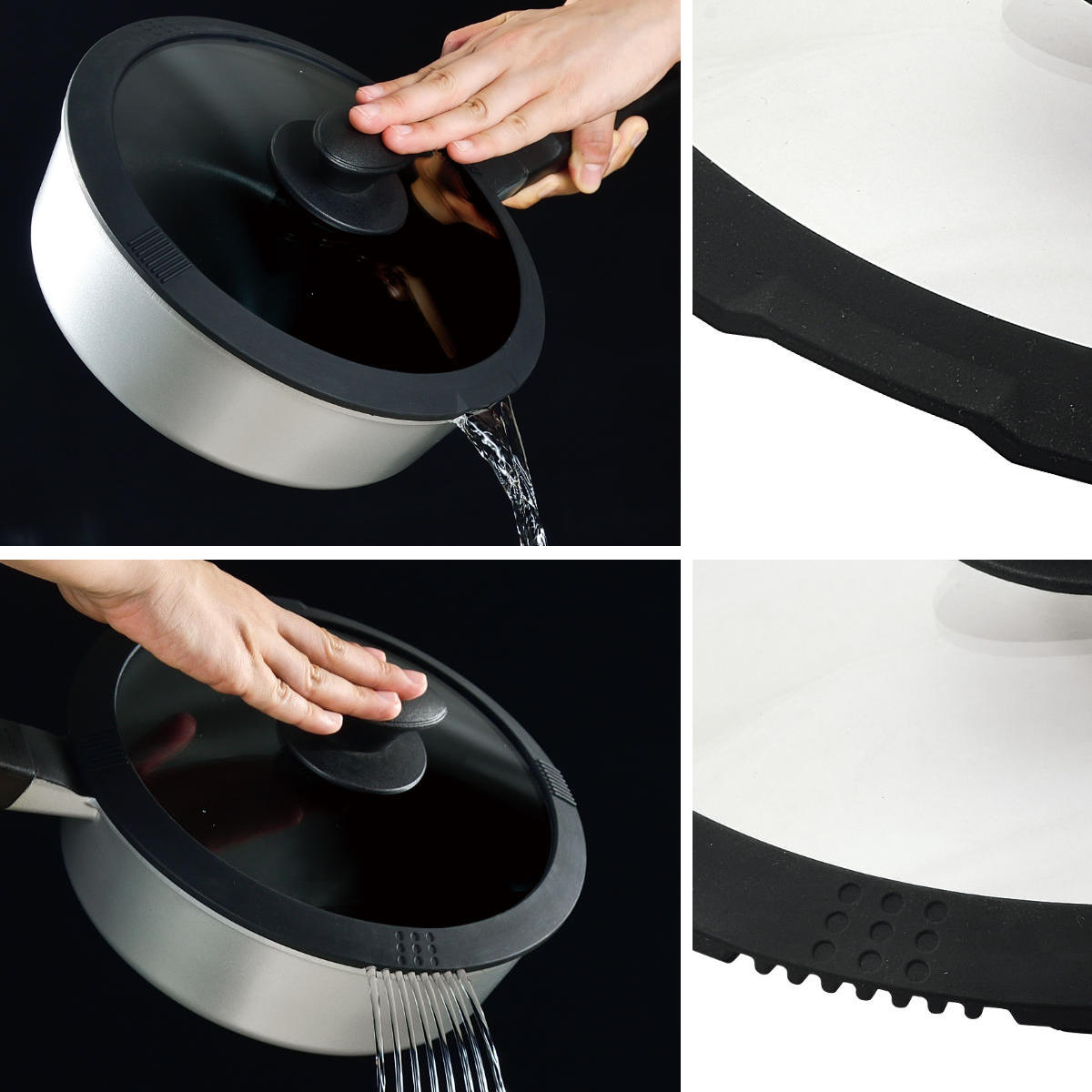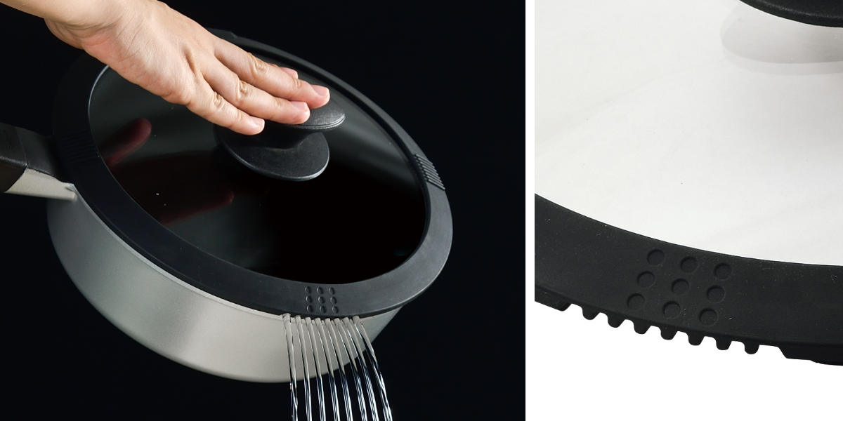 鍋蓋のフチはシリコンで、カバーされているので鍋やフライパンにキズが付きにくいです。