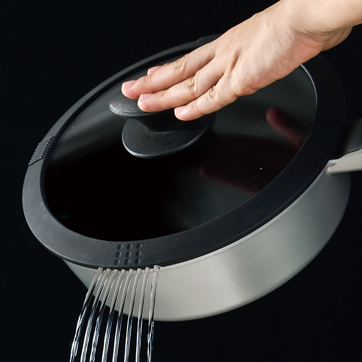 ザルを使わなくても、蓋をしたまま鍋を傾けてサッと湯切りができる鍋蓋です。野菜などの湯切りには「粗目」、麺類の湯切りには「細目」と2種類の湯切り口が付いています。