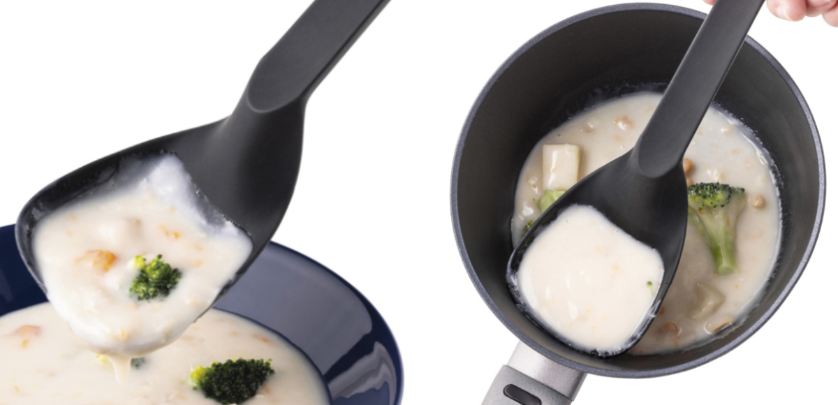 フライパンや鍋にフィットする形状のお玉です。先端はシリコーン製なので鍋を傷つけにくく、すくいやすく、具材をきれいにこそぎ取ることができます。