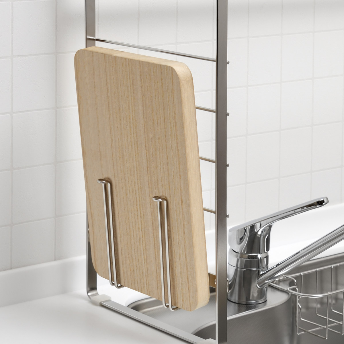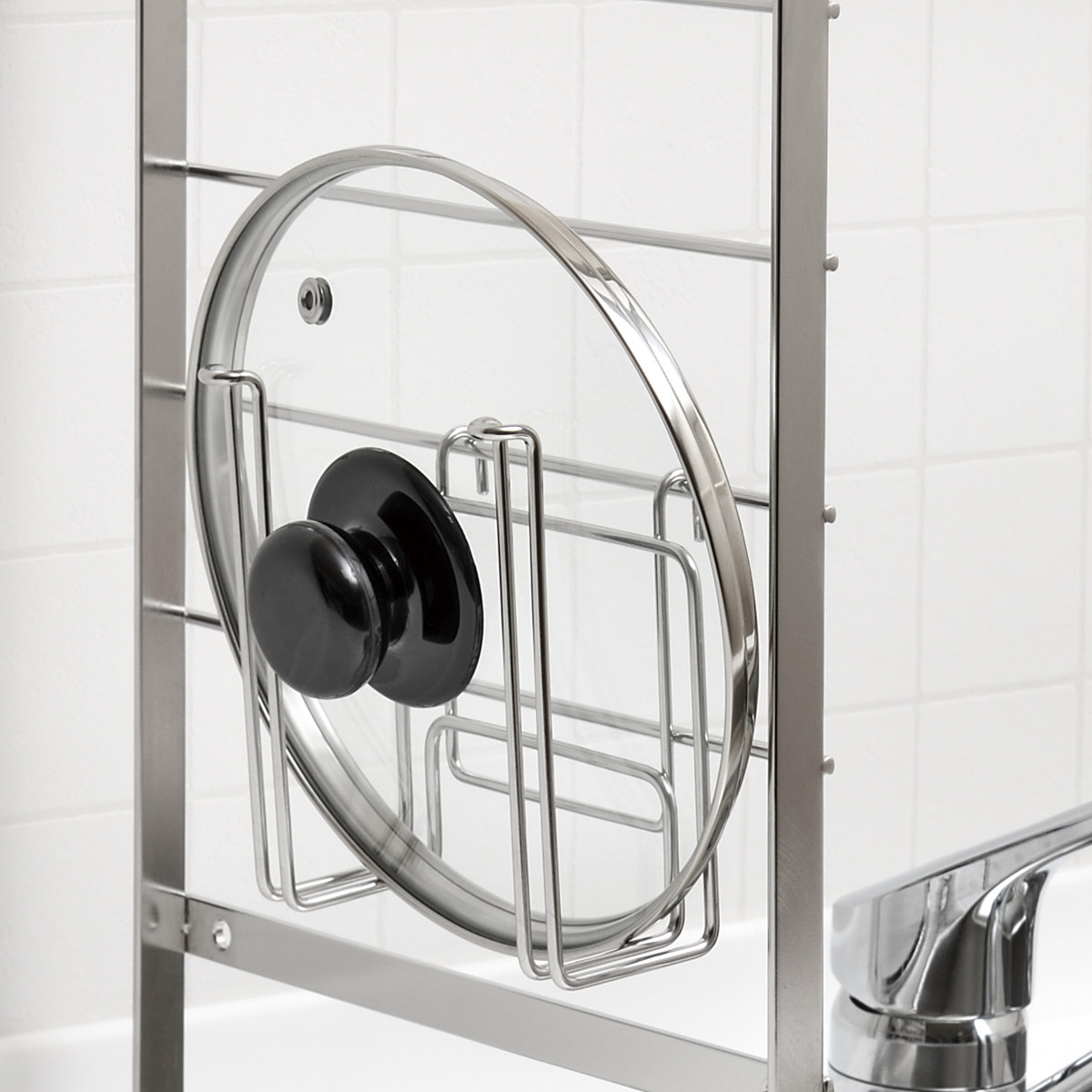 同シリーズ別売のベースラックと組み合わせて使えるマルチホルダーです。洗ったまな板を水切りしながら、まな板の定位置として収納できて便利です。また、収納場所に困る鍋のフタを水切り・収納するのにもおすすめです。