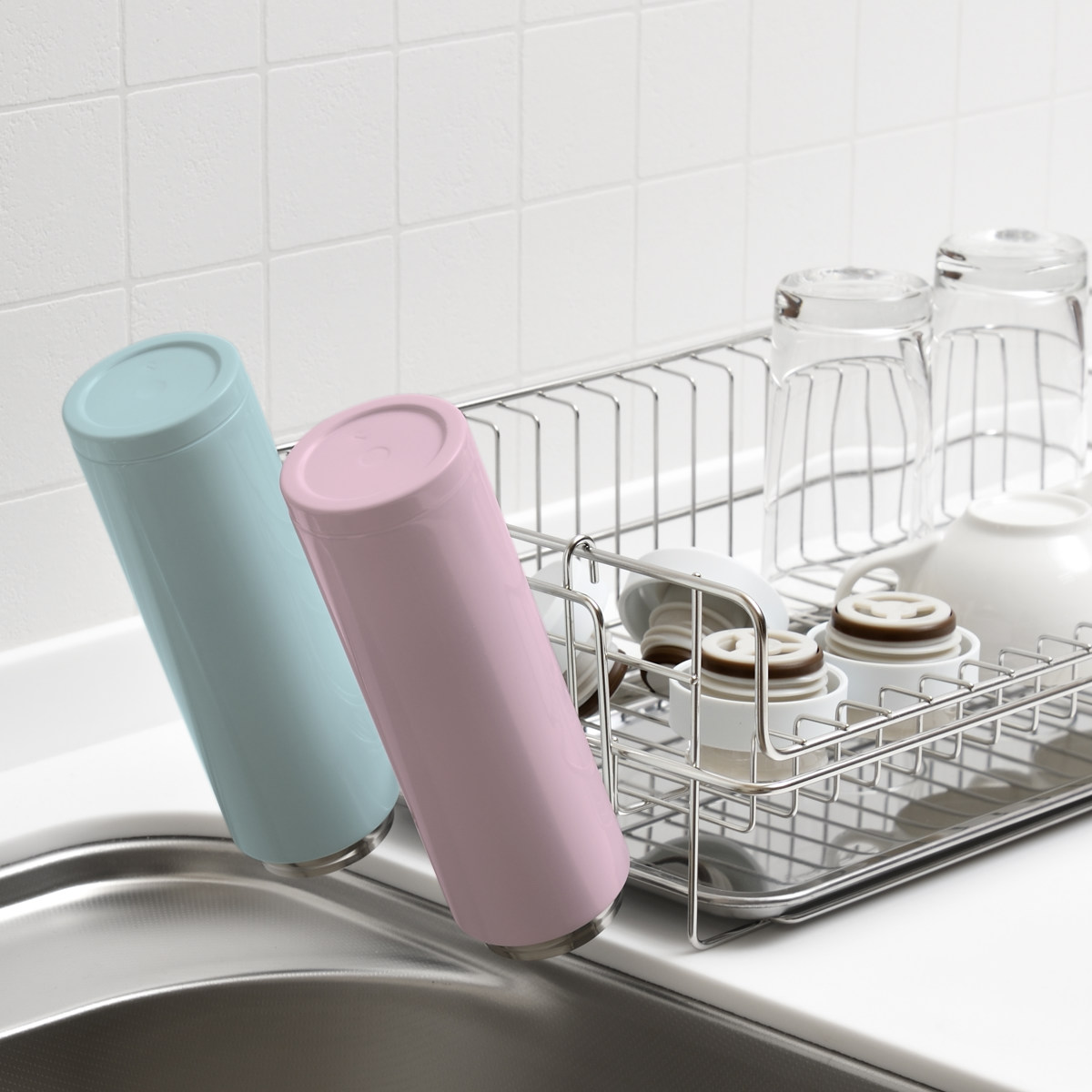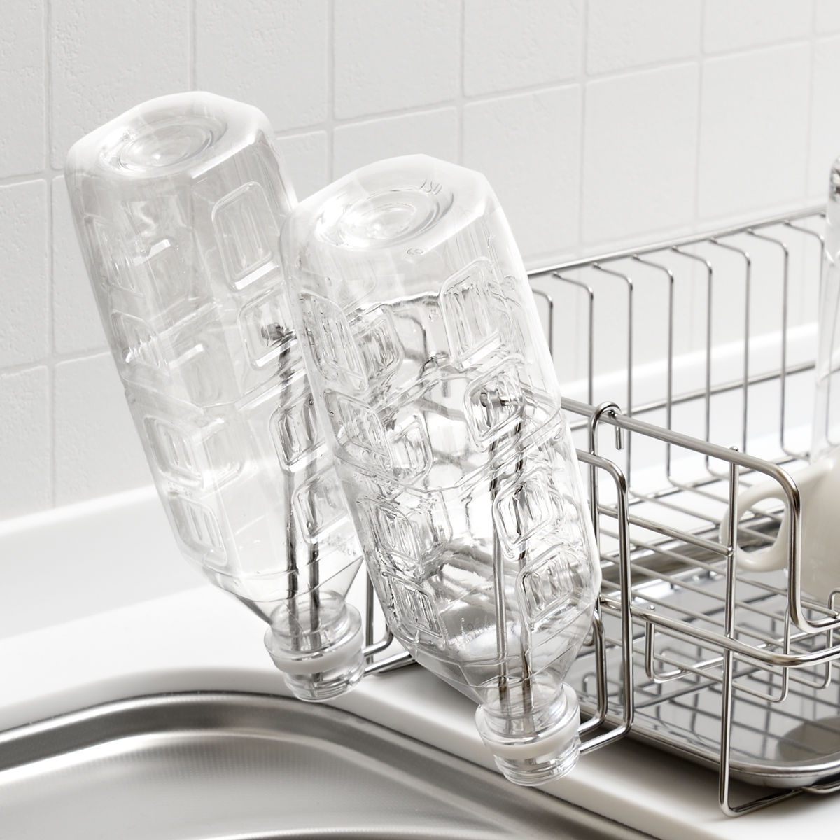 同シリーズ別売の水切りラックにも取り付けることができます。立てて乾かしにくいマグボトルや水筒、ペットボトルなどもしっかり乾かすことができます。