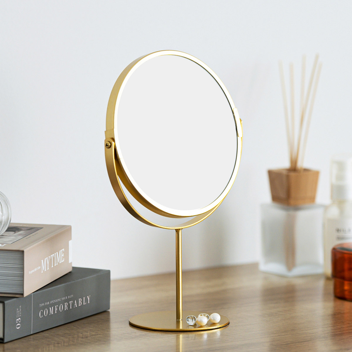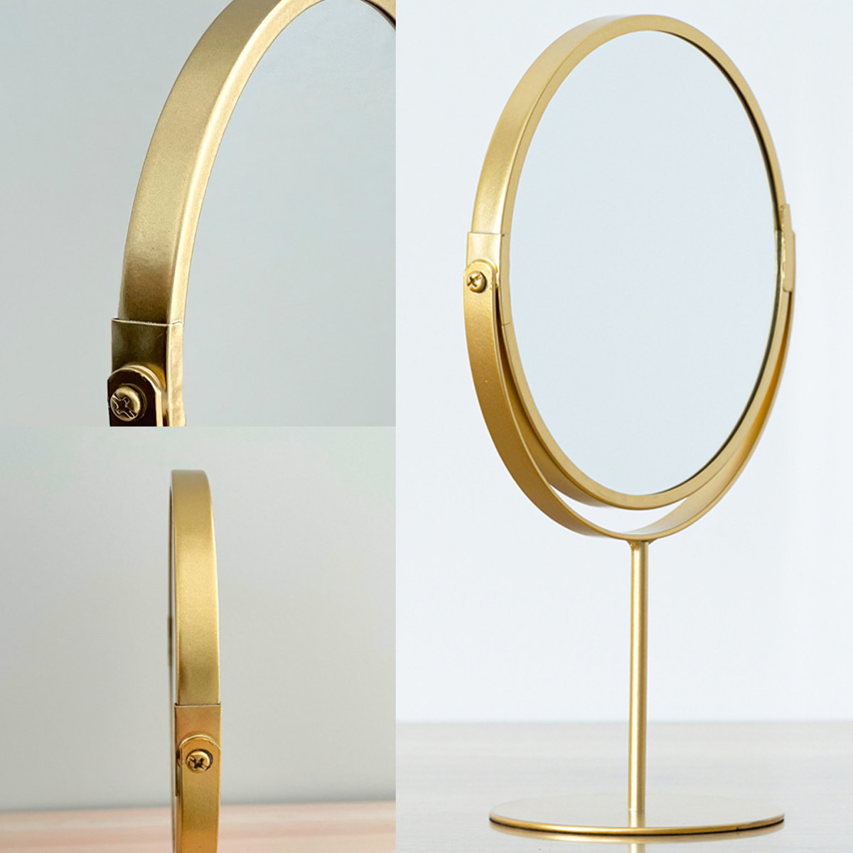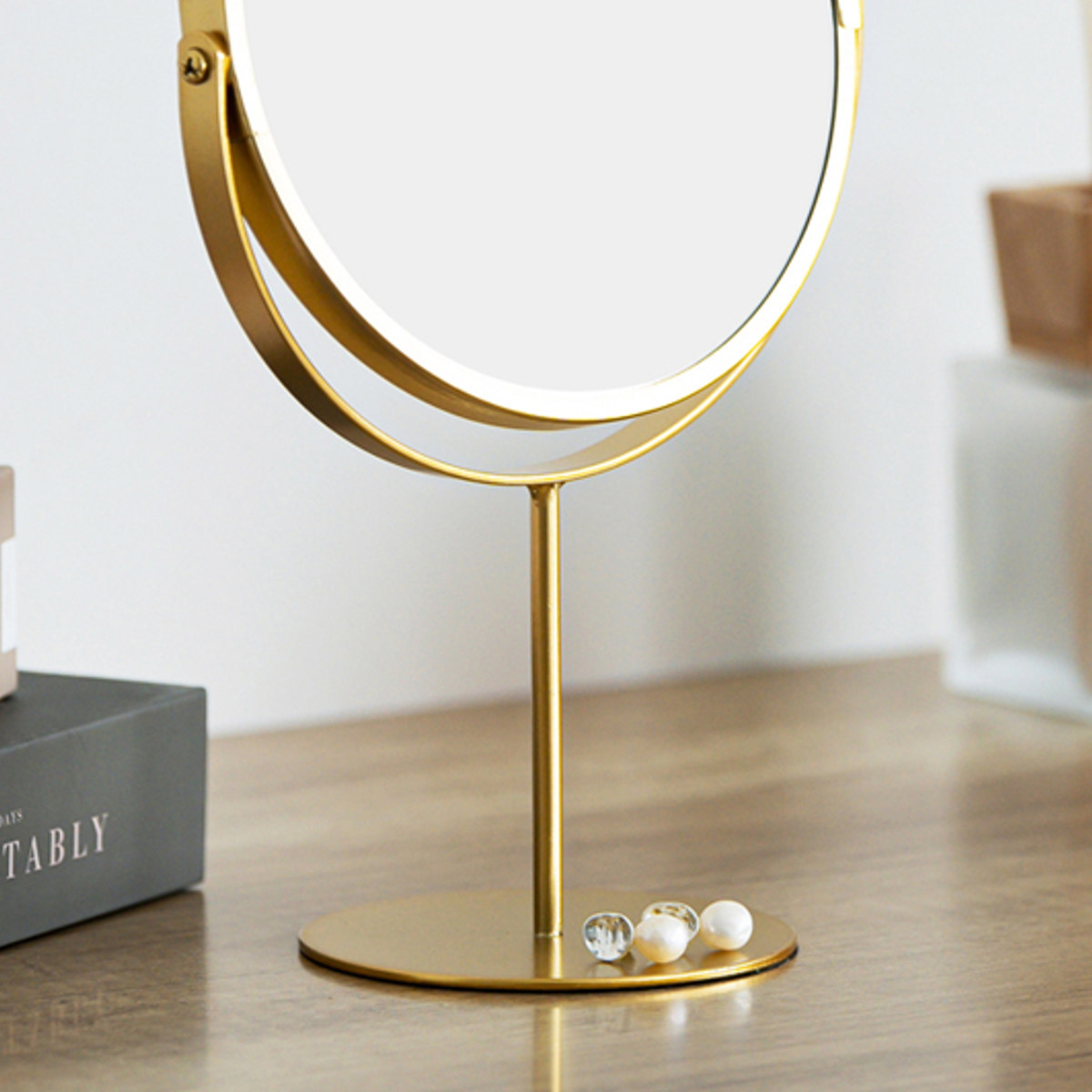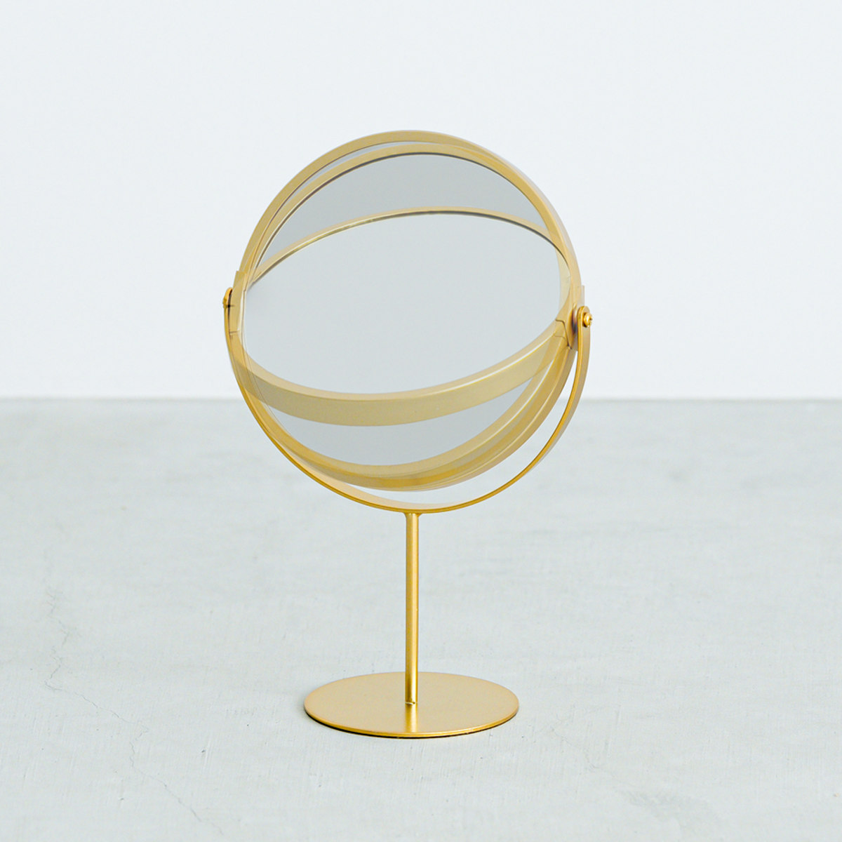 上品な空間を演出するゴールドカラーと、丸みのあるデザインの可愛らしさがポイントの卓上ミラーです。木製家具やホワイトインテリアとも合わせやすく、置くだけで空間に華やかさがプラスされます。
