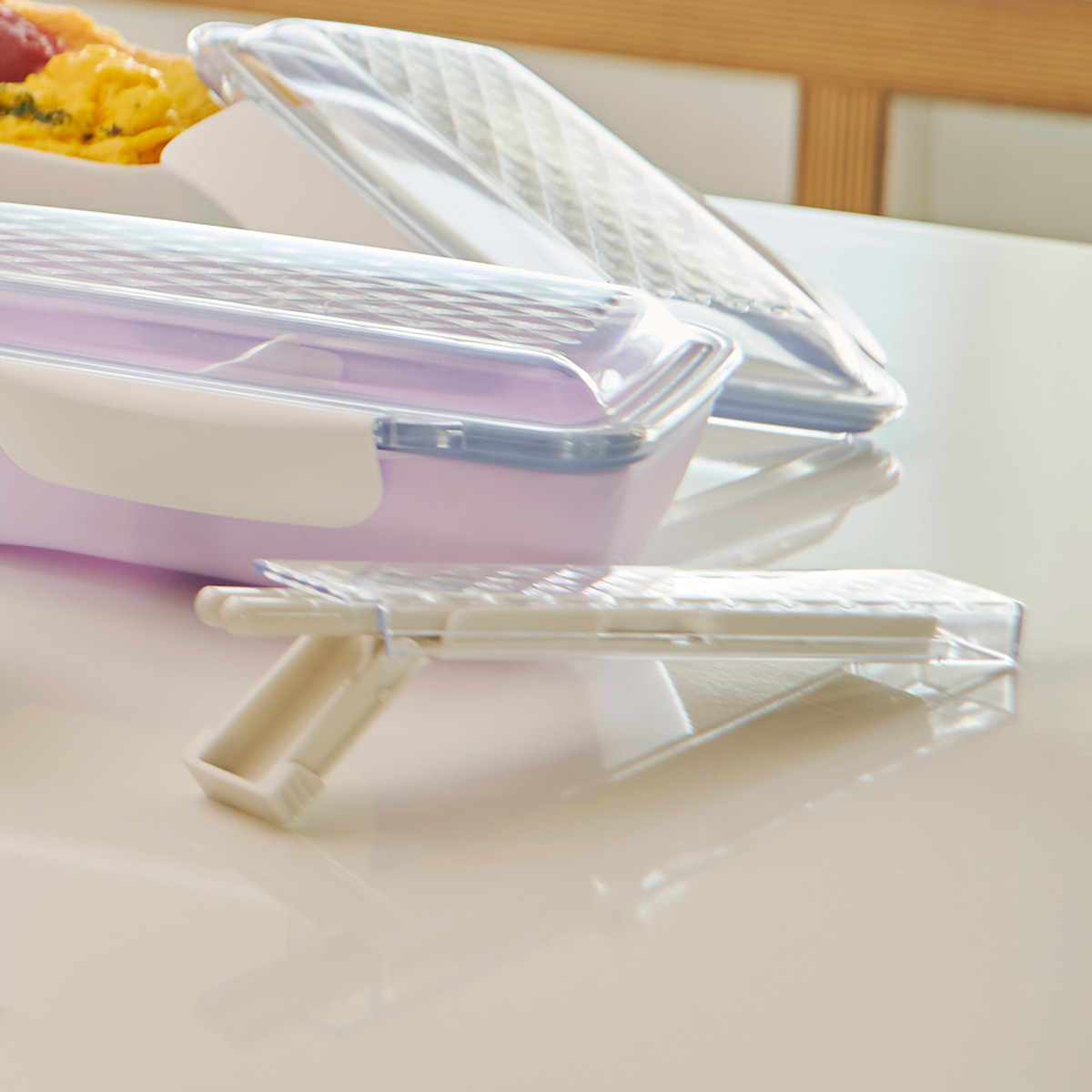 箸箱を少しスライドすると引き出した部分が下に折れ曲がり、お箸が取り出しやすい構造になっています。折り曲がる部分は10万回の耐久テスト済みなので安心してお使いいただけます。