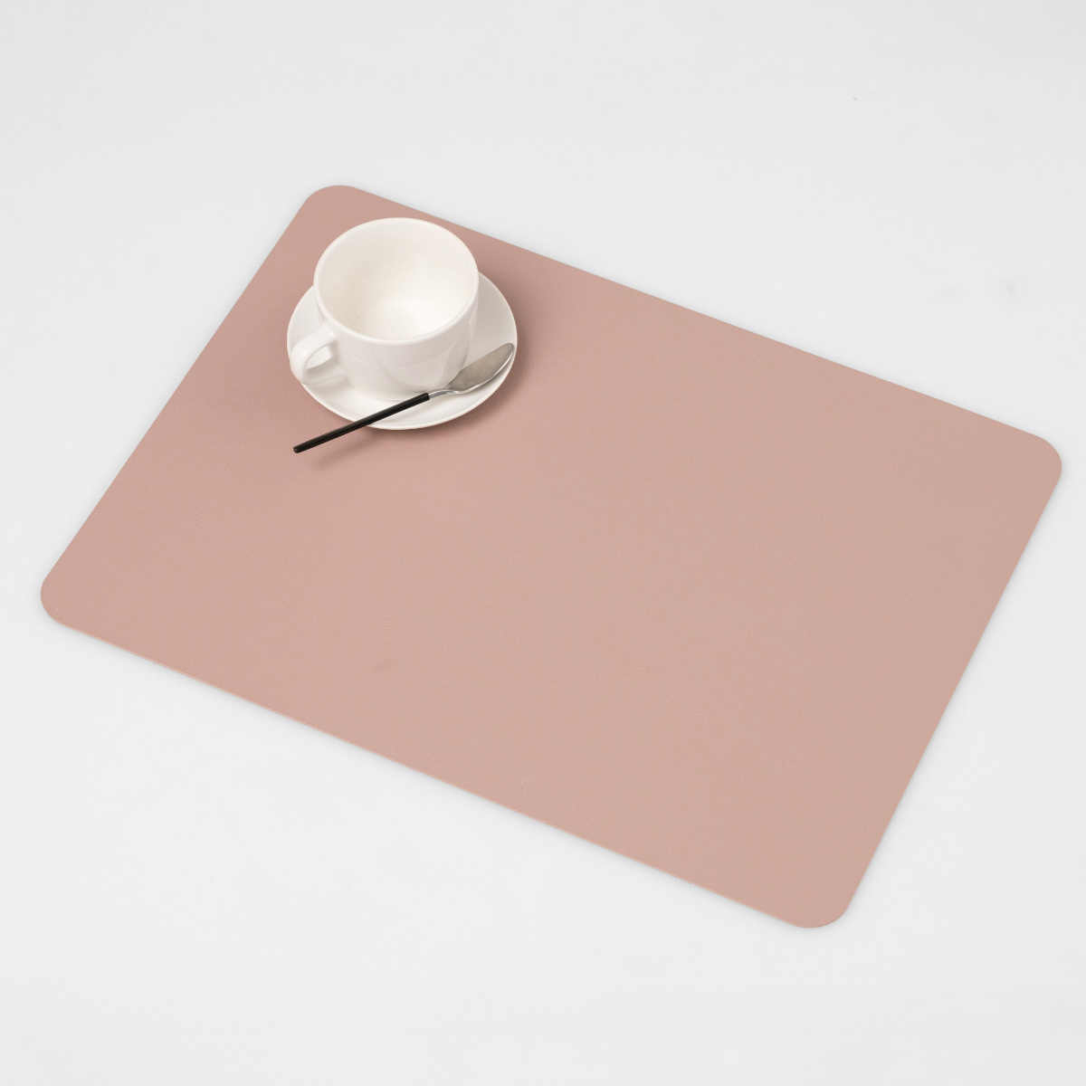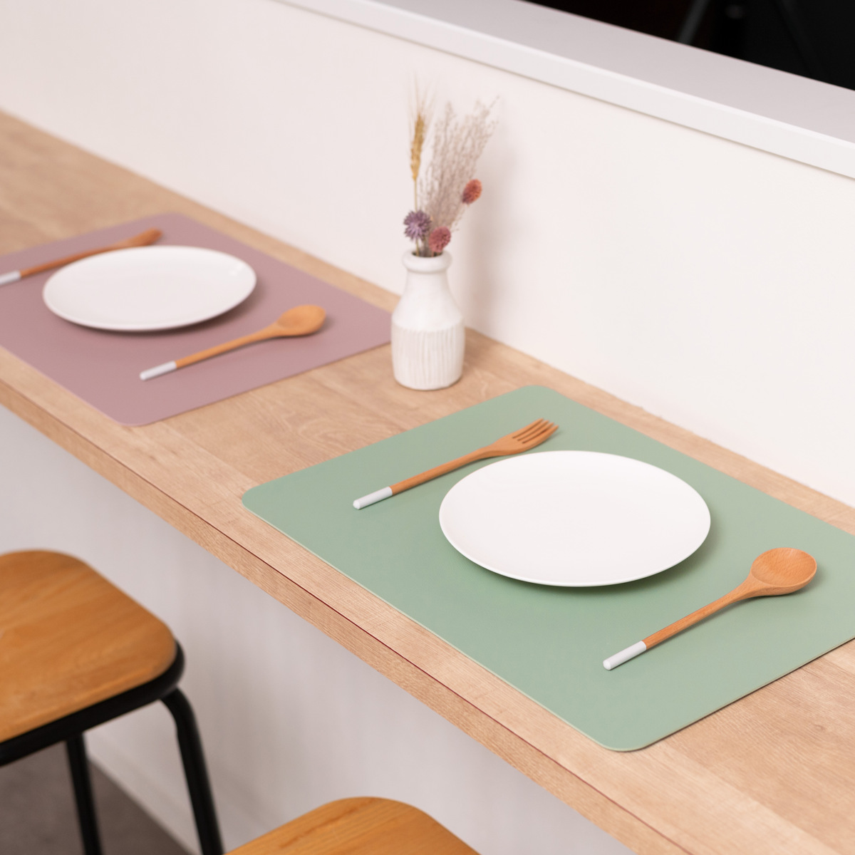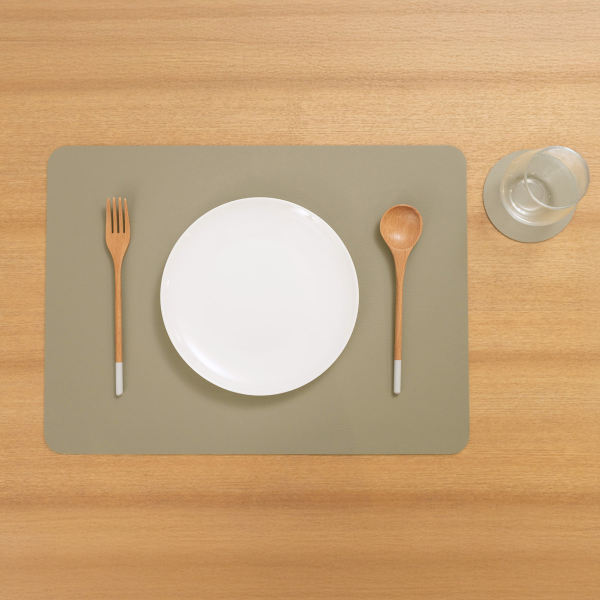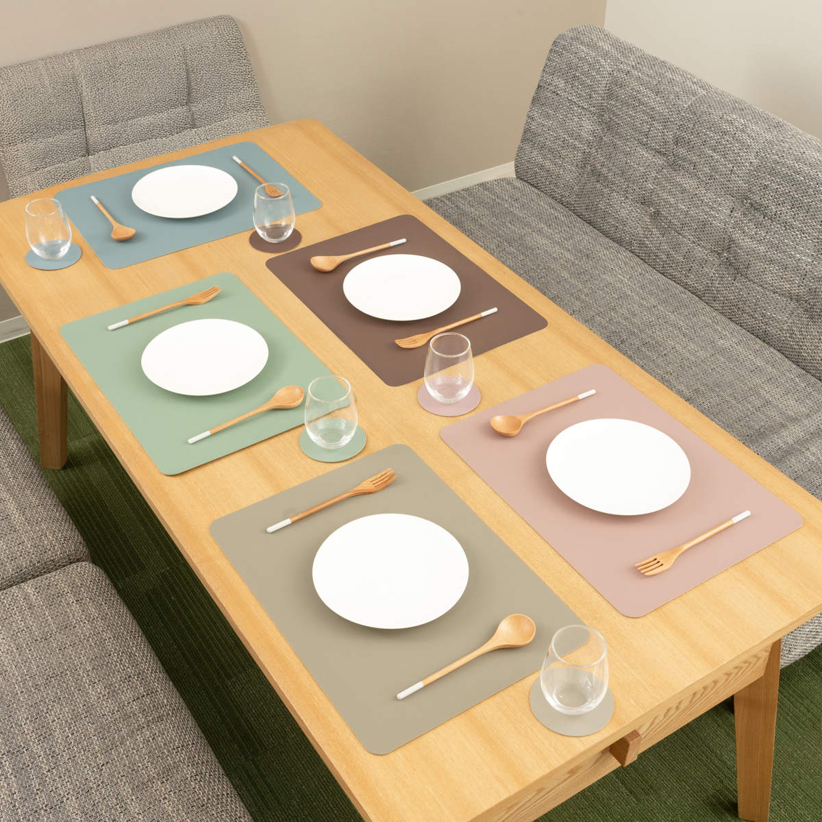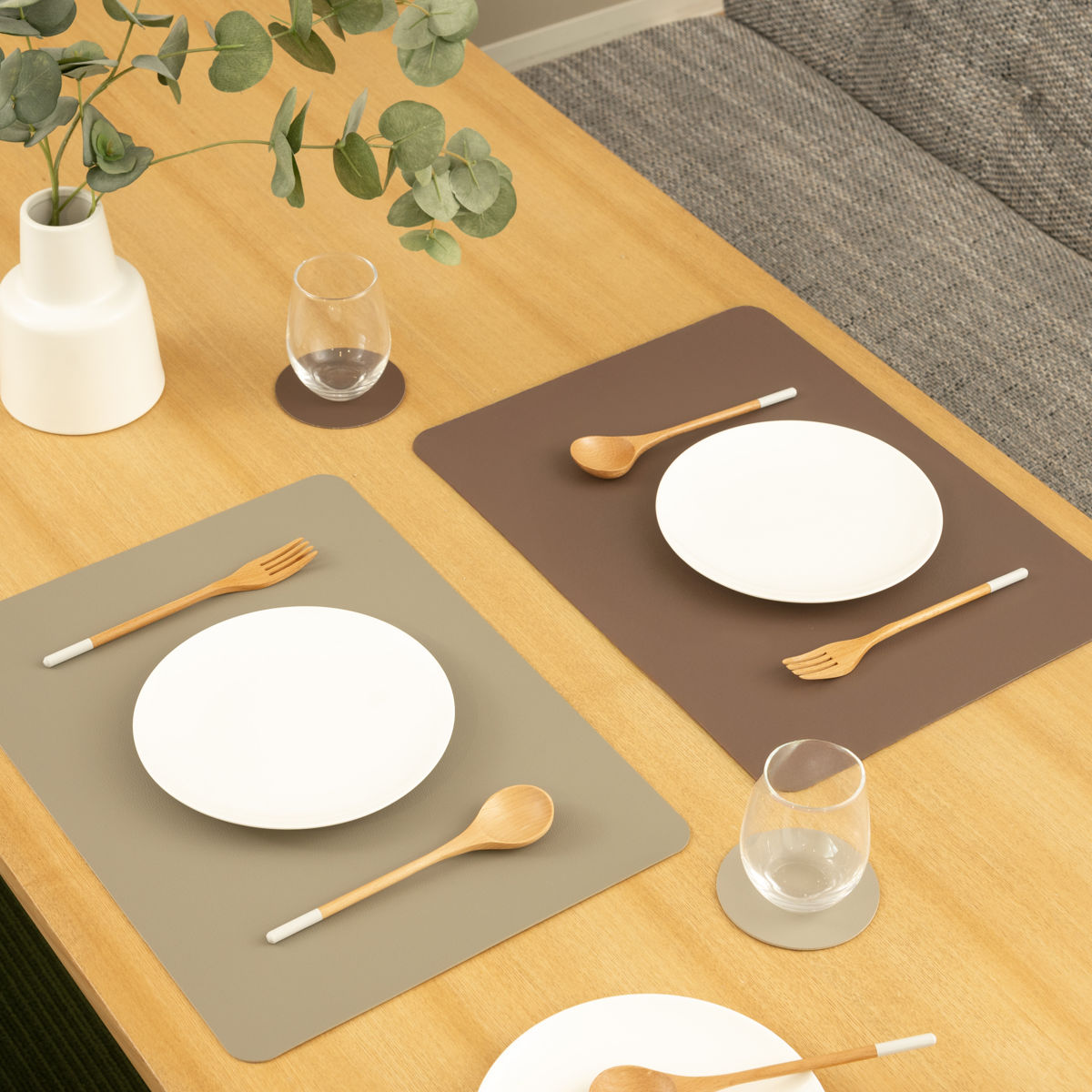 柔らかいレザーのような質感と、少しくすみのある上品なニュアンスカラーを組み合わせたプレイスマットです。いつもの食卓にプラスするだけで料理や器が引き立ち、テーブルコーディネートがより華やかになります。