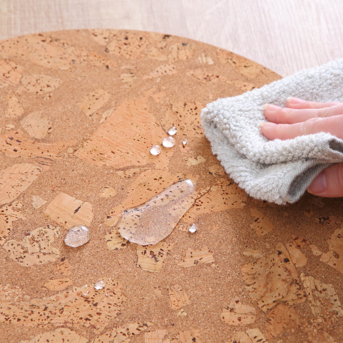 コルクは柔らかく、汚れや水に強い天然素材です。グラスの水滴や飲み物がこぼれても、サッと拭き取れてお手入れも簡単です。