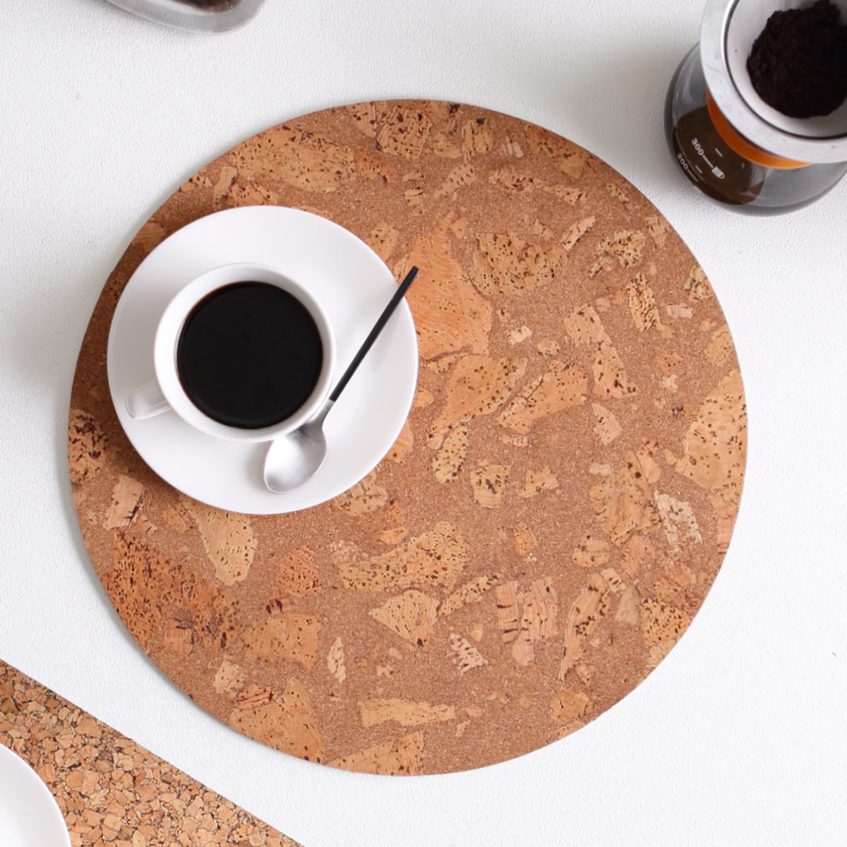 コルクは衝撃吸収性があるので、テーブルを傷や汚れから守り、グラスやお皿を置くときの音を和らげます。さらに耐熱性にも優れているので、熱々のお皿や鍋も安心して置くことができます。