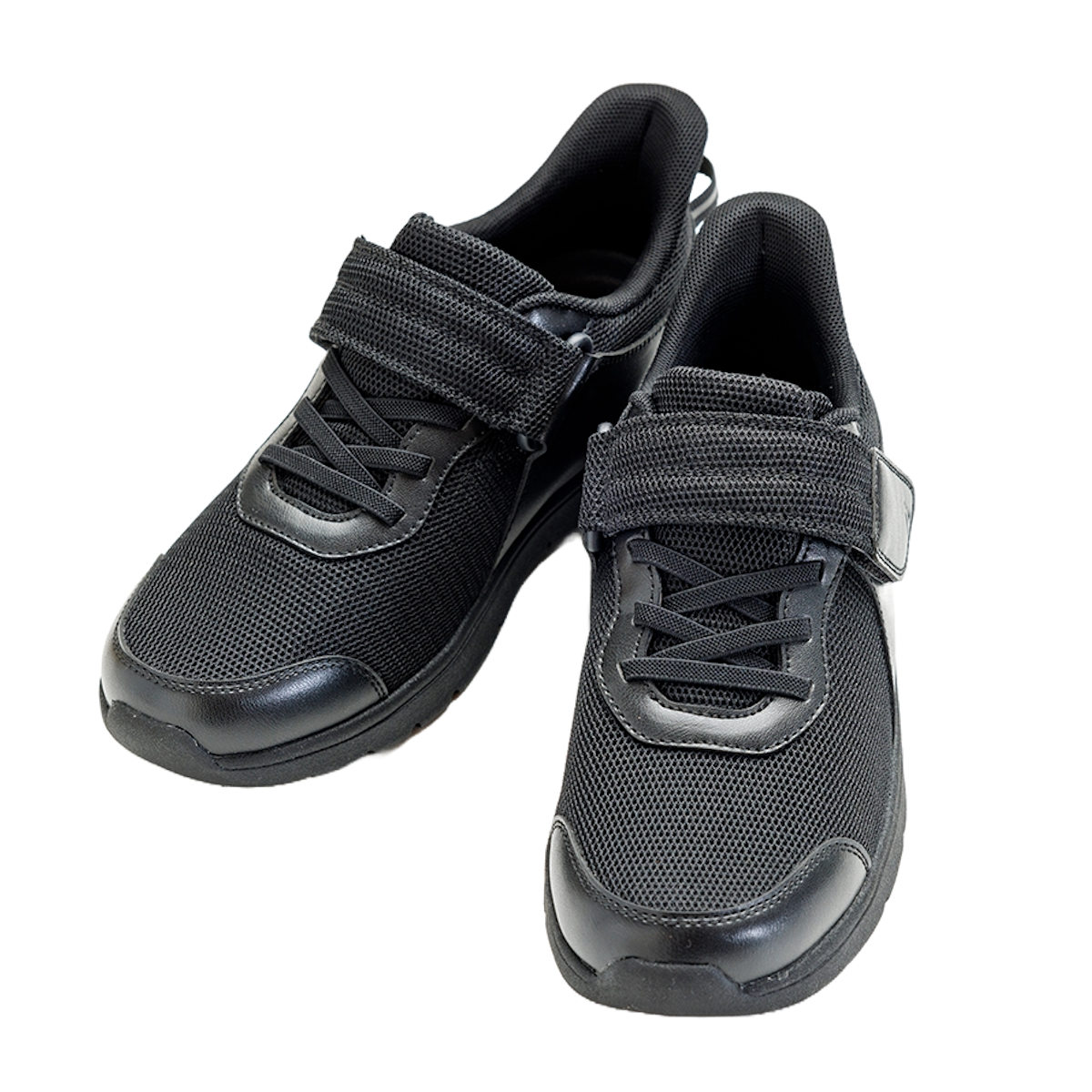 ゴム紐をあしらった、カジュアルなスニーカー風のケアシューズです。靴ベロが2枚あり、両開きするので、とても履きやすいです。ハリのある生地なので、巻き込みにくく画期的な形状です。面ファスナー付きベルトで足をしっかりと固定できます。