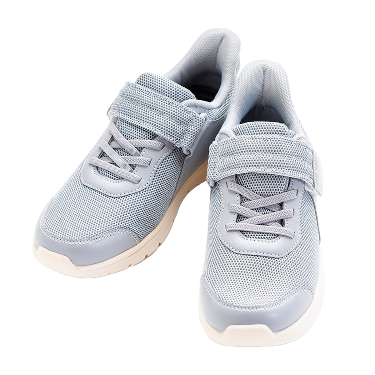 ゴム紐をあしらった、カジュアルなスニーカー風のケアシューズです。靴ベロが2枚あり、両開きするので、とても履きやすいです。ハリのある生地なので、巻き込みにくく画期的な形状です。面ファスナー付きベルトで足をしっかりと固定できます。