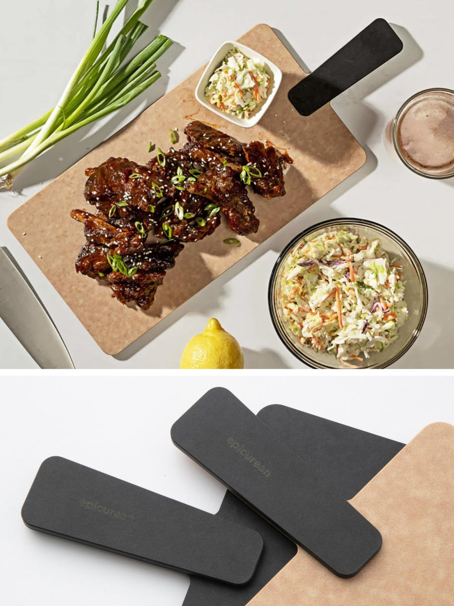 天然木の繊維を合成して作られ、耐久性に優れたエピキュリアン。軽くて薄く、機能性にも優れた使い勝手の良さが魅力です。ハンドルを付けることで、カットした食材を鍋に移したり、食卓へ持ち運びやすくなりました。