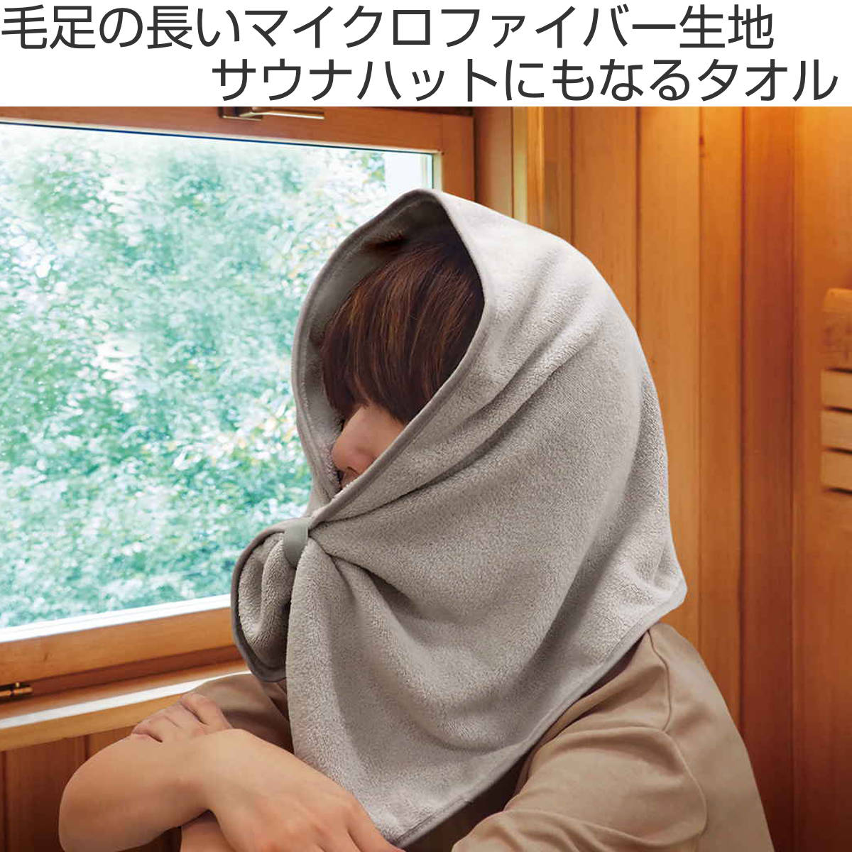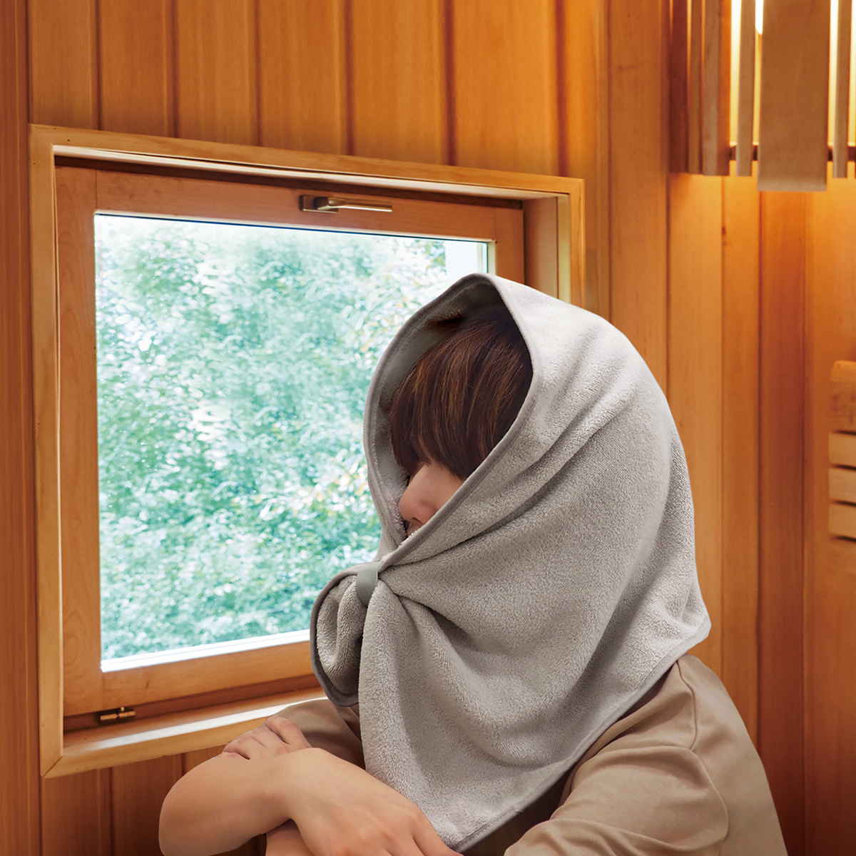 頭に巻いてサウナハットとしても使えるタオルです。口元や首元でゴムに通して止めることができます。サイズが大きいので、顔も覆ってサウナの熱風よけにも使えます。