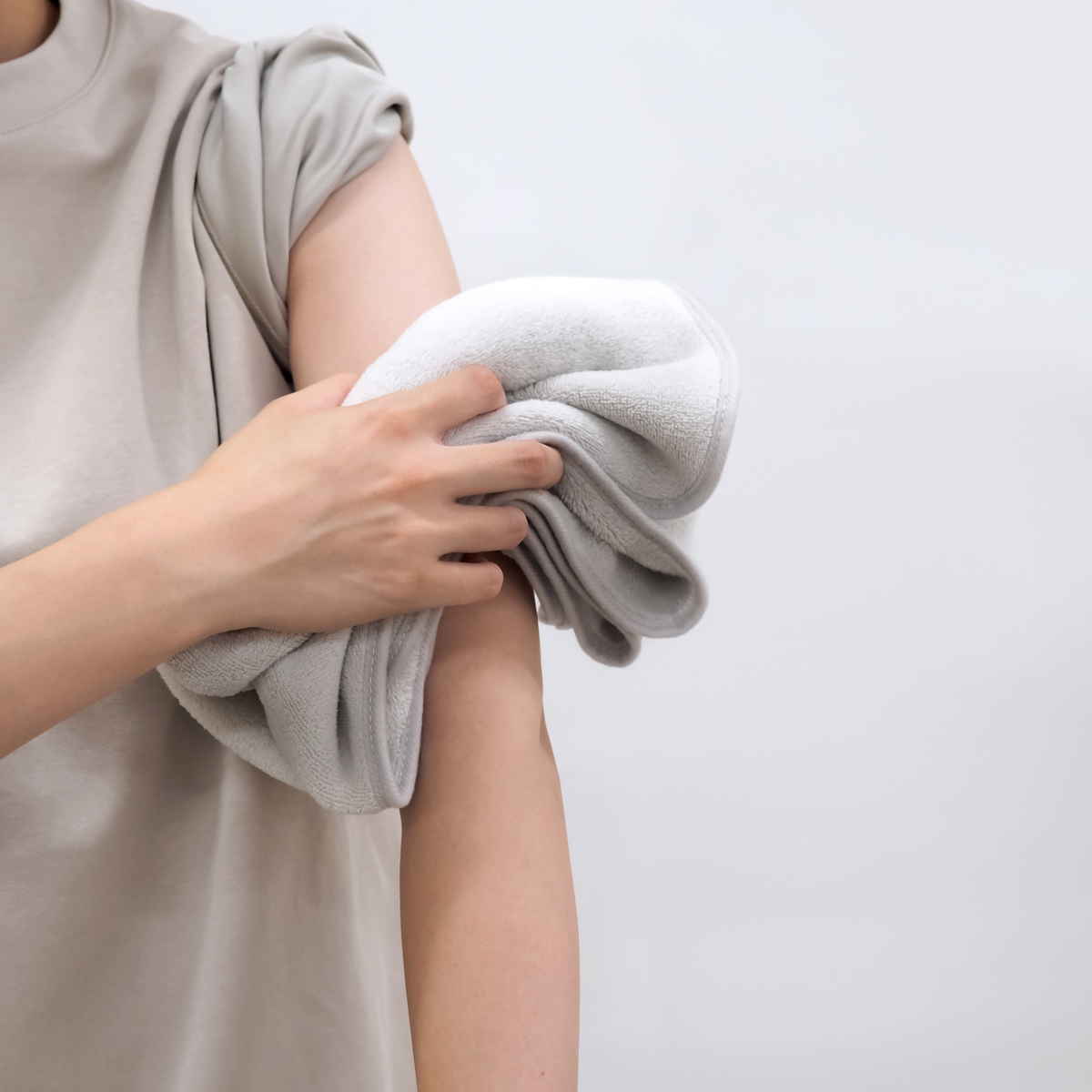 マイクロファイバー生地なので吸水性が良く、汗や湯上がりの水滴の拭き取りにもお使いいただけます。
