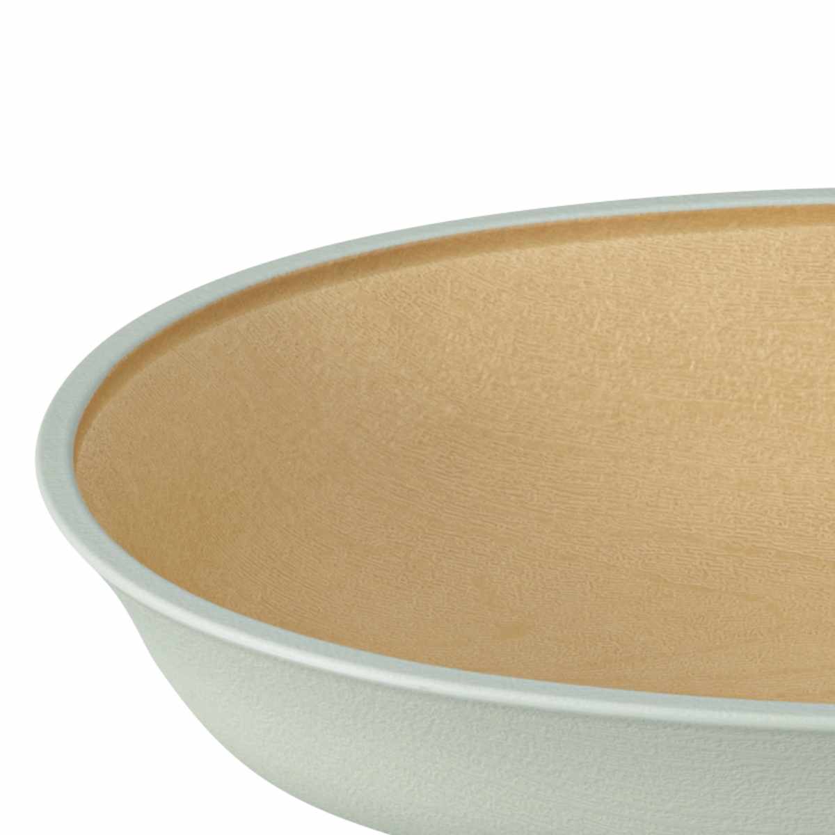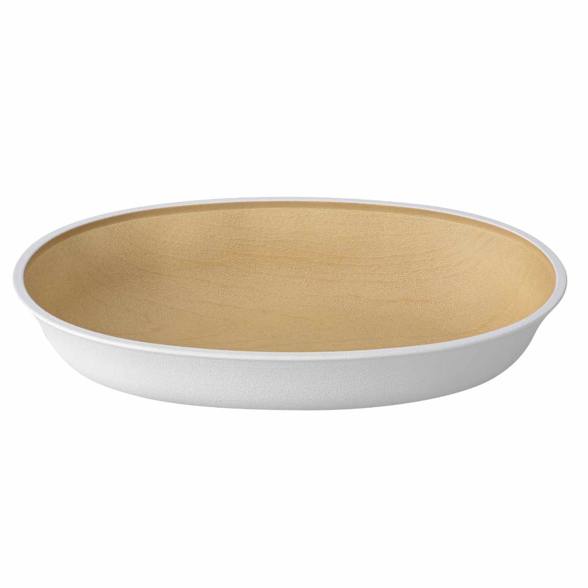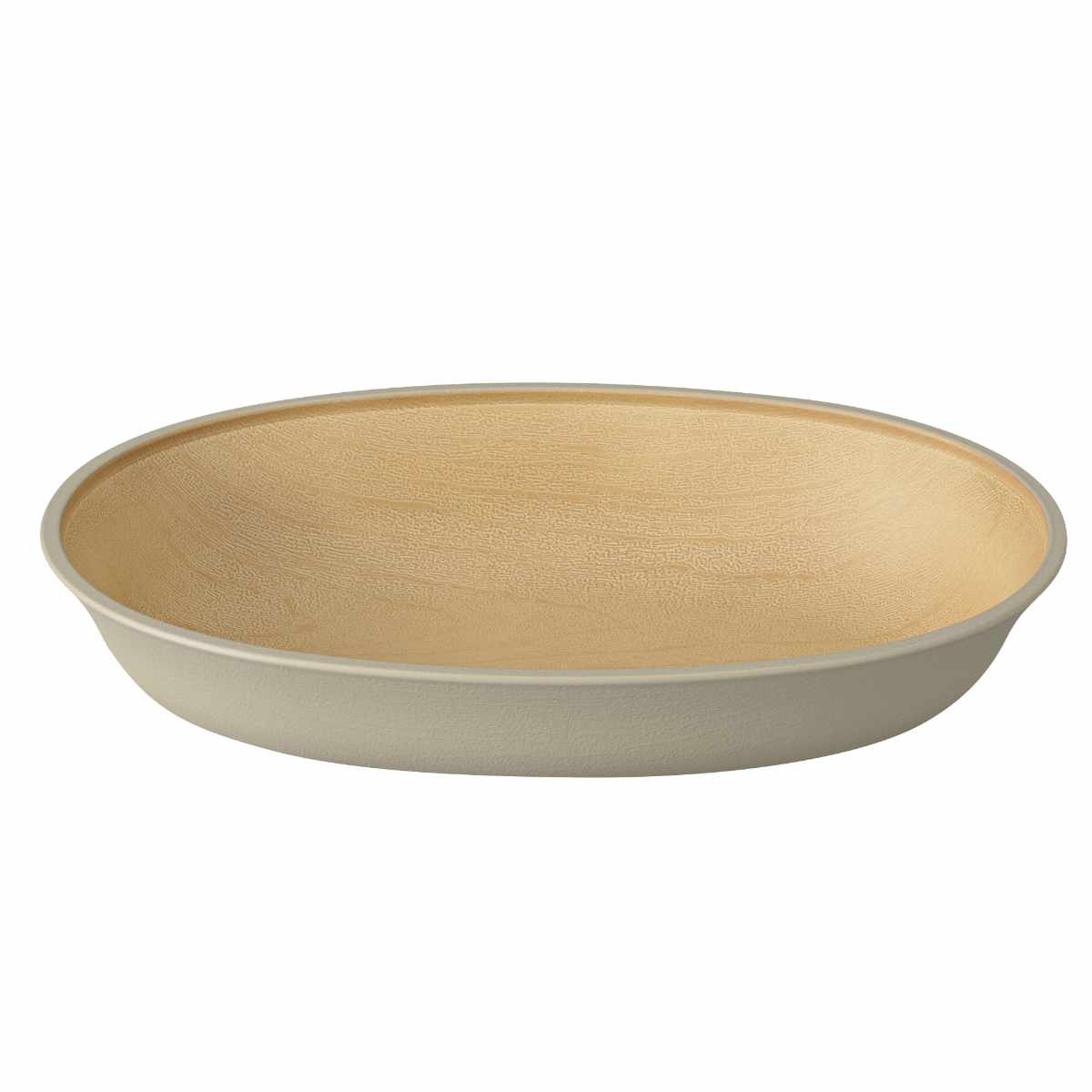 一人分のパスタやオムライスの盛り付け、カレーを盛り付けるのにもぴったりな大きさです。程よい深さがあり、汁気のあるお料理にも使いやすいです。外側の淡い色合いと内側が木目調カラーが優しく調和されていて毎日使いに飽きがこないです。