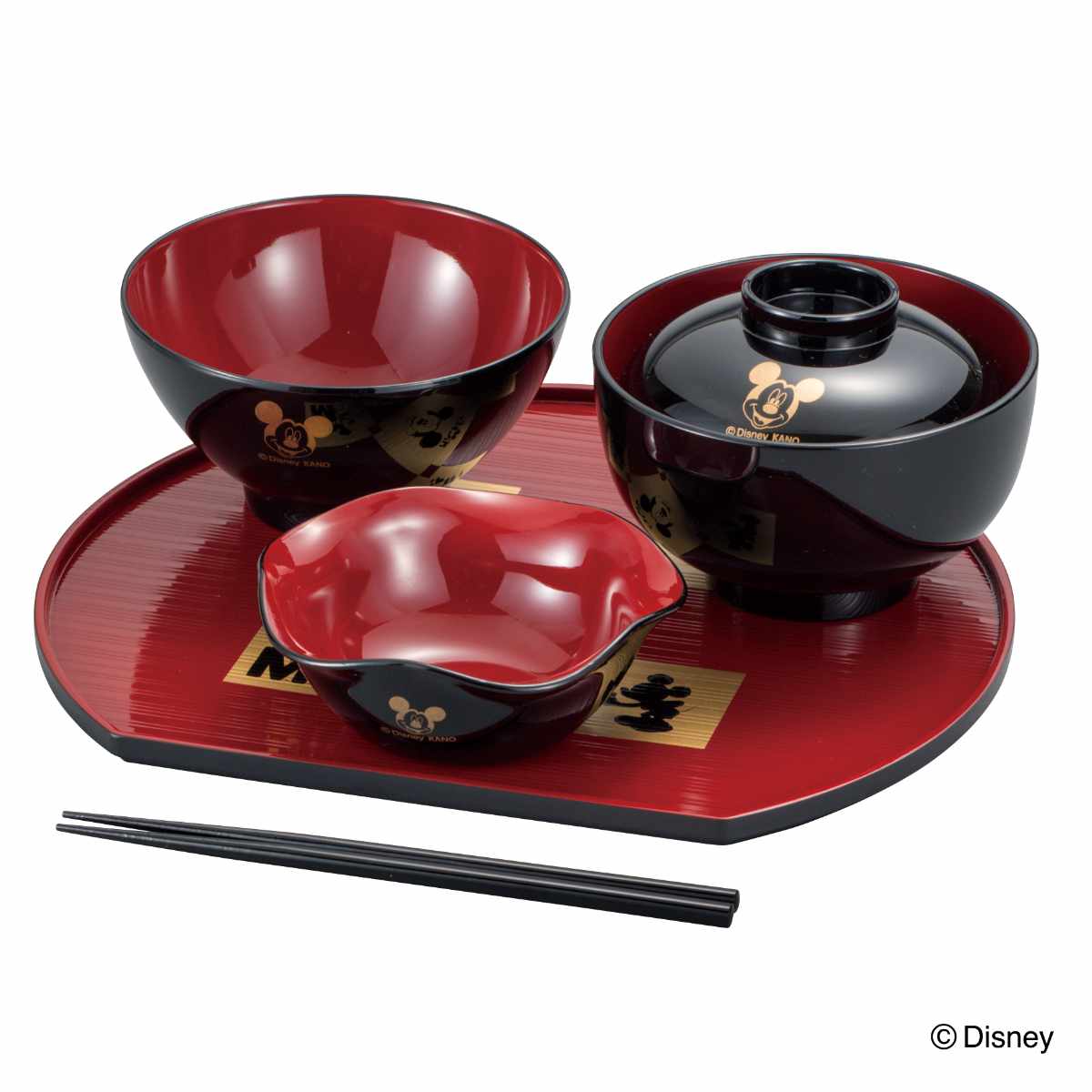 飯碗、汁椀、花小鉢、箸、膳の5点セットです。器にも御膳にもミッキーのイラストが描かれていて赤ちゃんを笑顔にしてくれます。