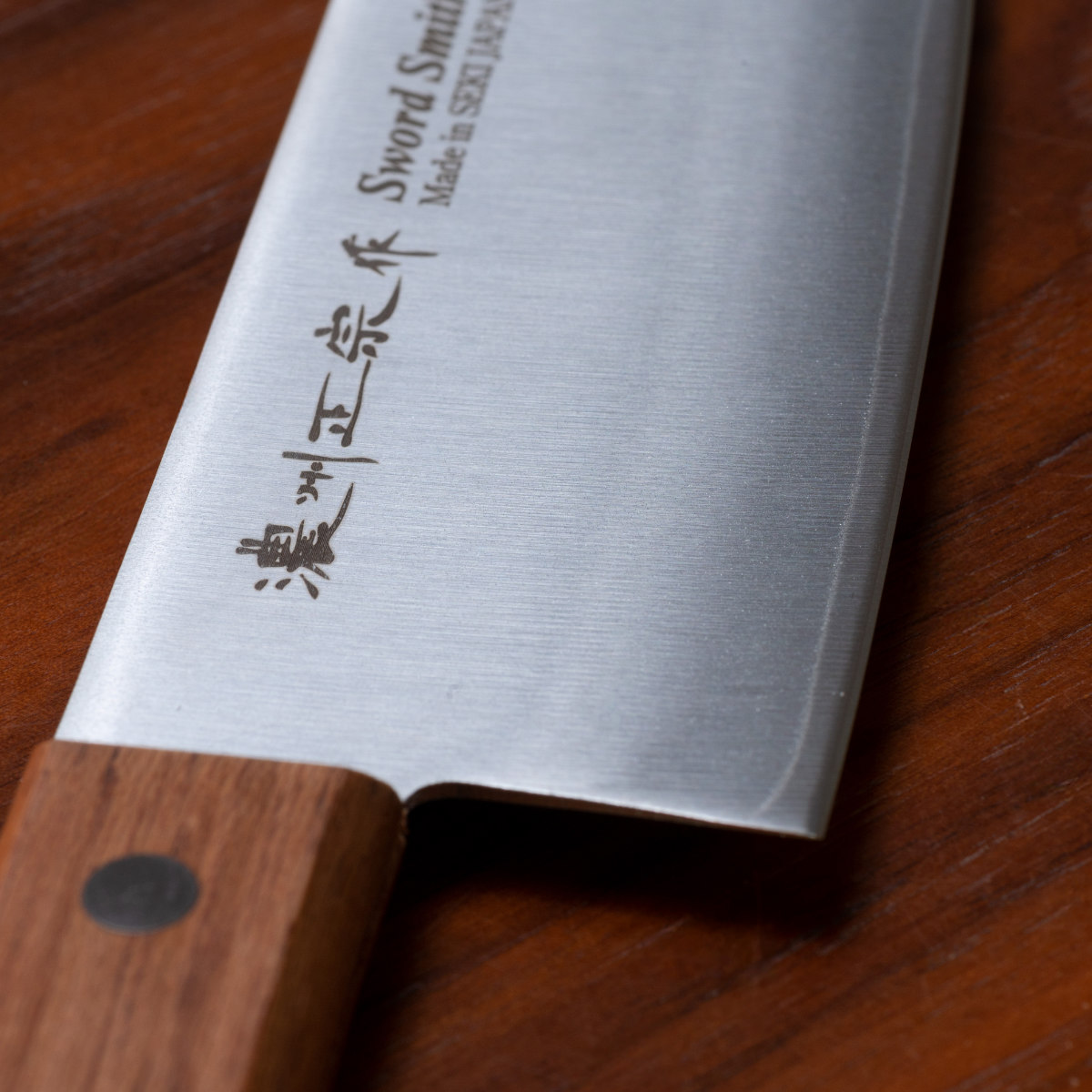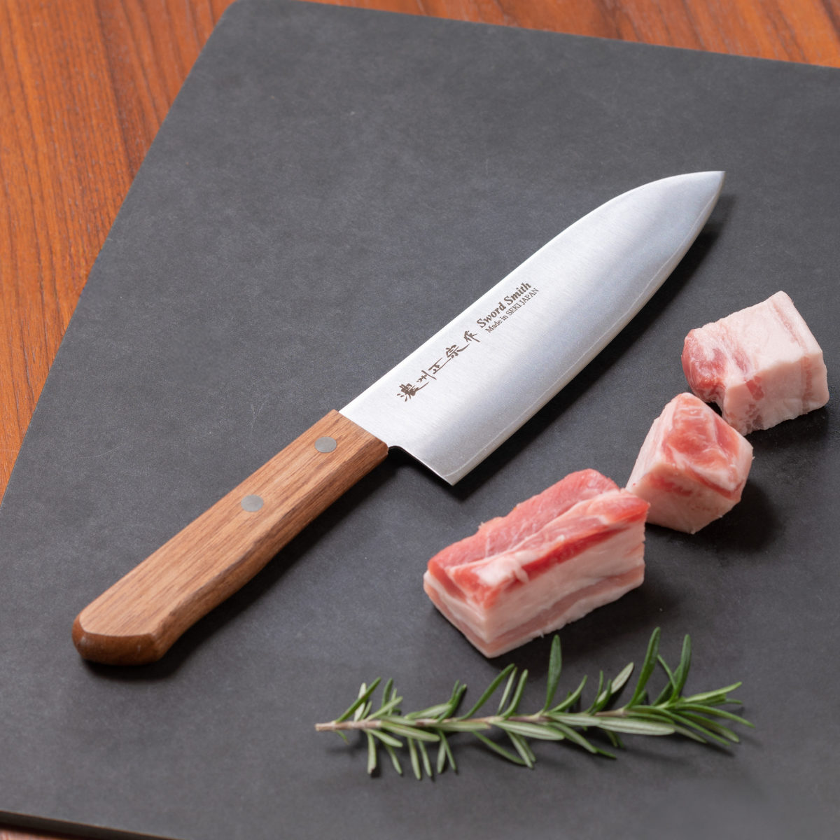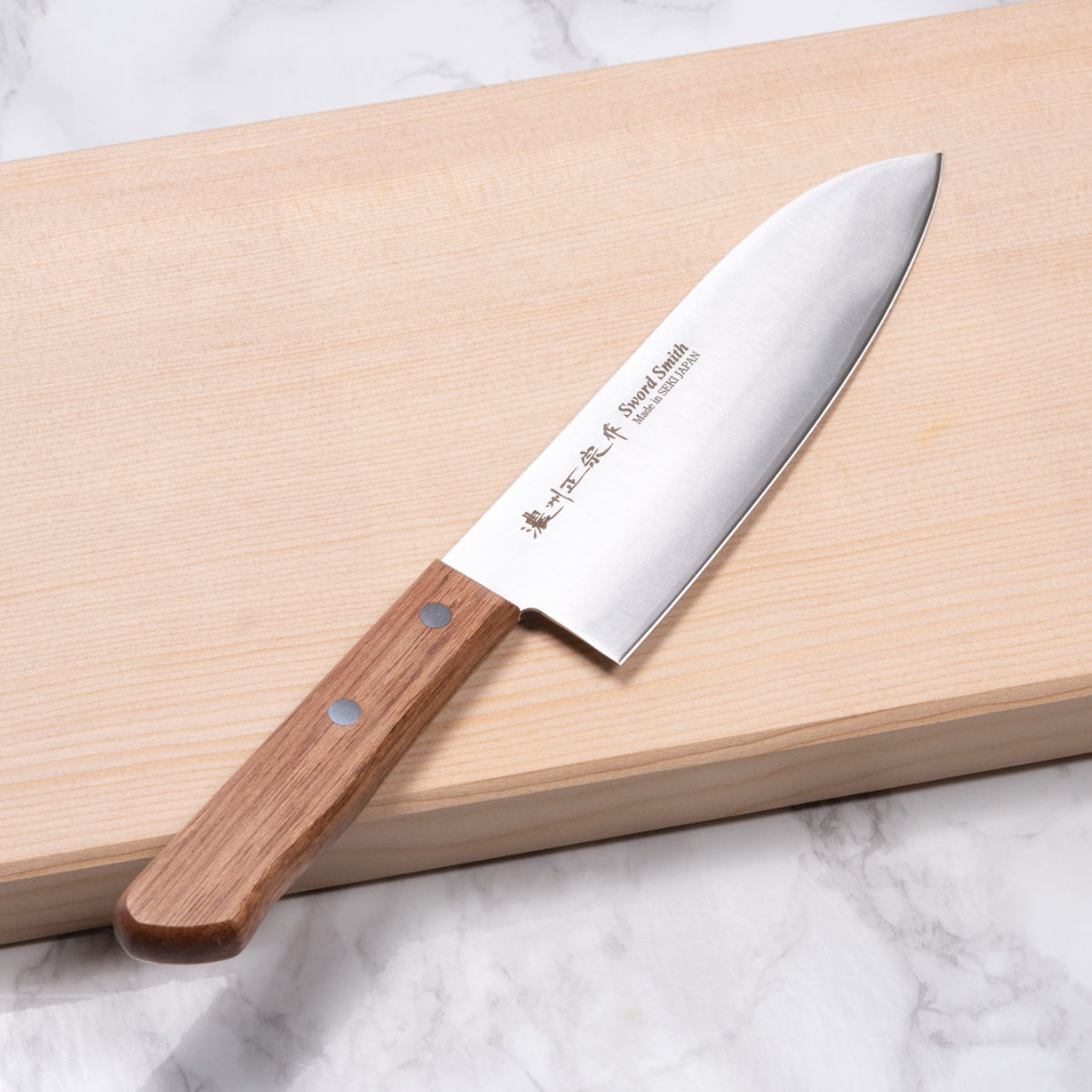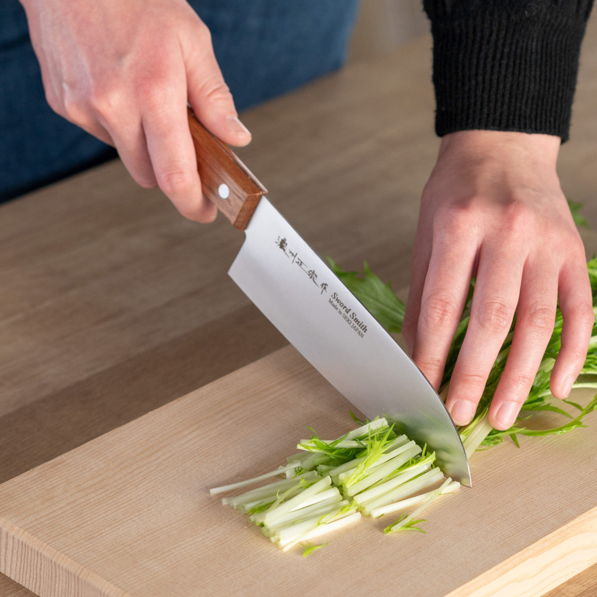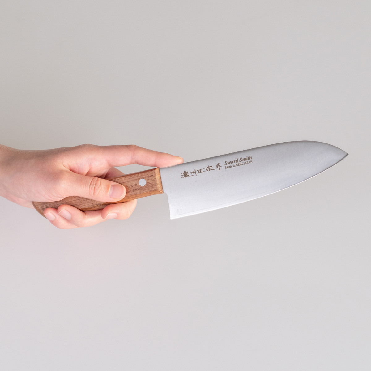 重さわずか100gの、軽くて扱いやすい三徳包丁です。割込み包丁は、真ん中の鋼材を両サイドから挟む三層鋼の作りになっているため重くなりがちですが、熟練の技術により刃をきわめて薄くすることで軽量化を実現しました。