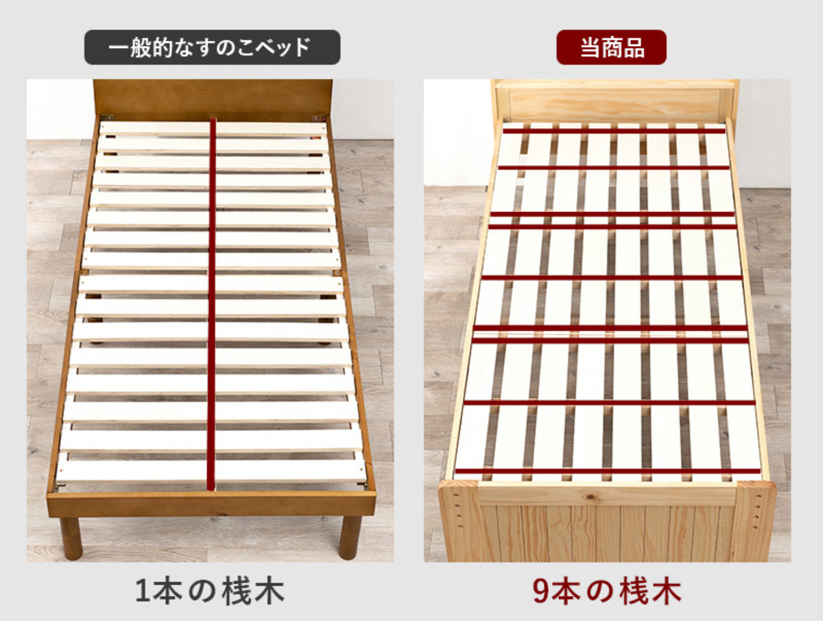 一般的なすのこベッドと比べてすのこ間隔が狭く設計されているので、敷き布団でもしっかりと支えることができます。今お手持ちの敷き布団を継続して使えるので経済的です。