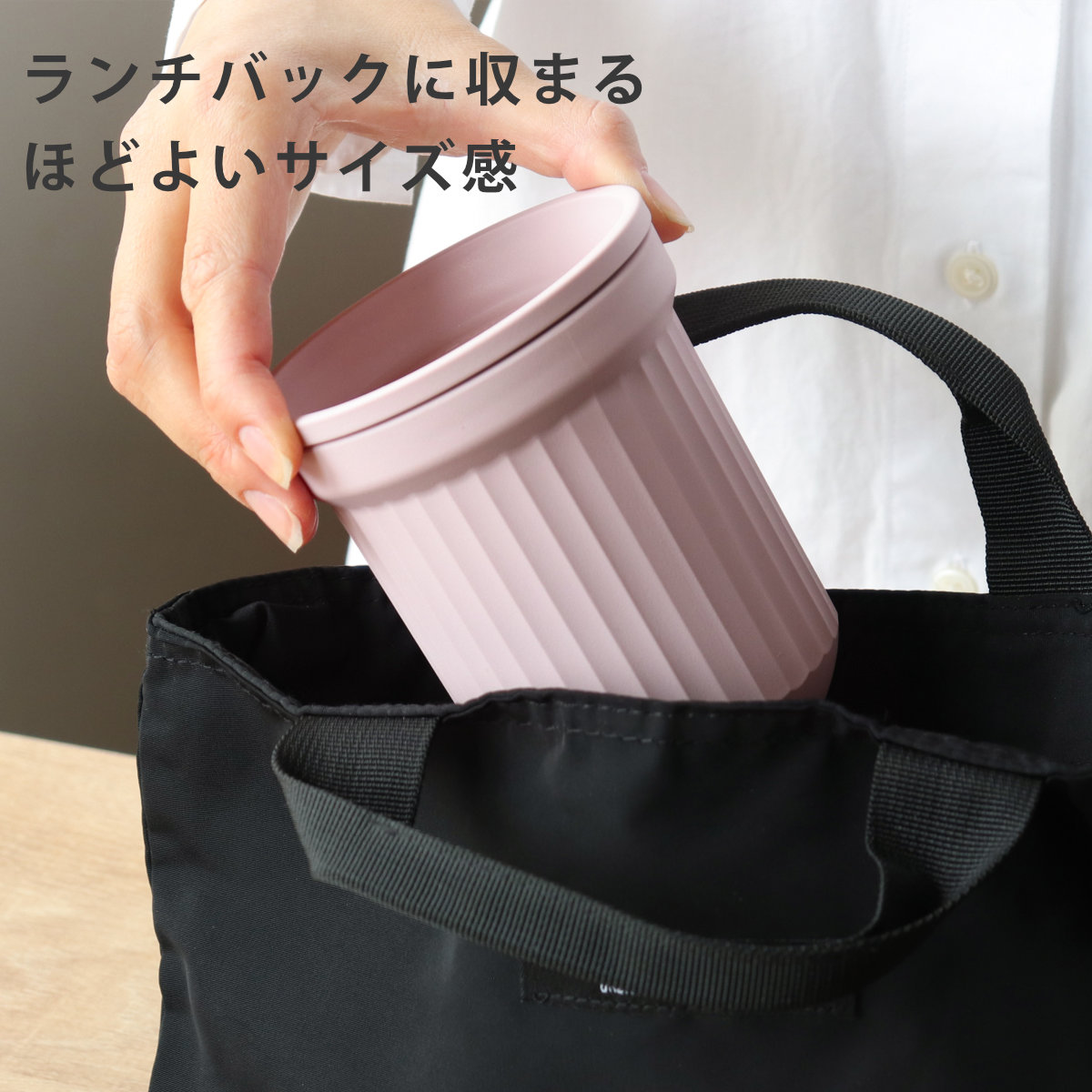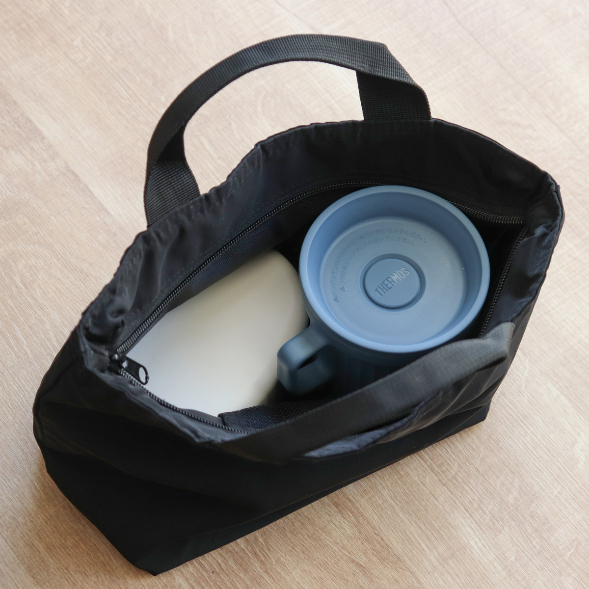 ランチバッグに収まるサイズ感です。マグ単体はもちろん、お弁当箱と一緒にバッグに入れて持ち歩くこともできます。
