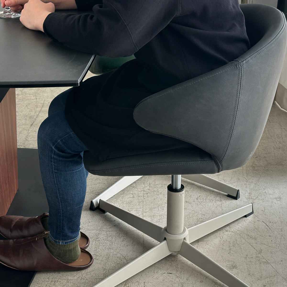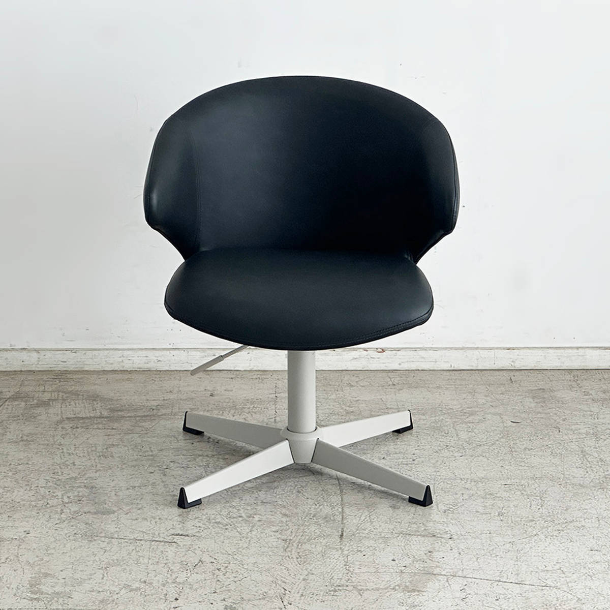 アルネ・ヤコブセンがデザインした北欧家具を代表する傑作の一つ、「スワンチェア」からインスパイアを受けて再デザインが施されたチェアです。特徴的な十字脚に丸みを帯びた包み込まれるような座面形状が、快適な座り心地を提供します。