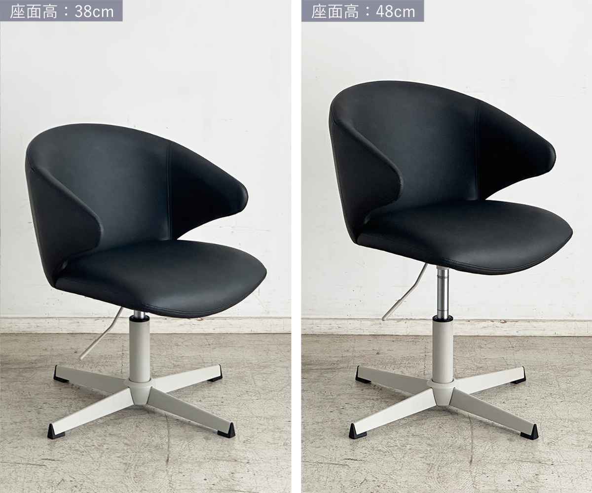 座面の高さを無段階で変えられる、ガス昇降タイプです。座面高38cm~48cmの間でちょうどいい高さに設定可能。レバーを引いて調節するだけの簡単調節で、電源も不要です。