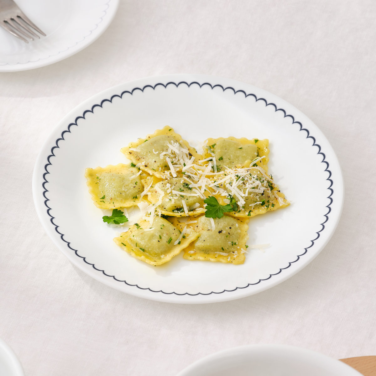 カスピアンレースのデザインはホタテ貝の模様からインスピレーションを得ており、繊細な装飾にフォーカスしながら、波模様をシンプルかつ心地よく表現しています。ネイビーのディテールが入ったすっきりとしたホワイトカラーは、軽やかで快適な肌触りで、毎日のディナーウェアにおすすめです。