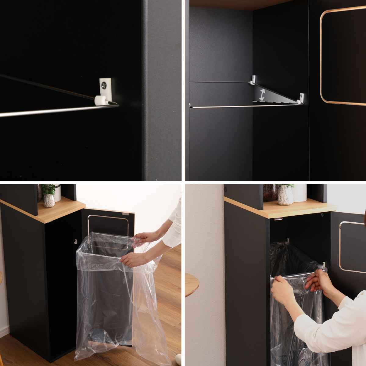 前扉を開き、リングを外して袋をかぶせ、中のフックに引っ掛けるだけで簡単にゴミ袋のセットが完了します。磁石付きなので沢山捨ててもしっかり閉まります。