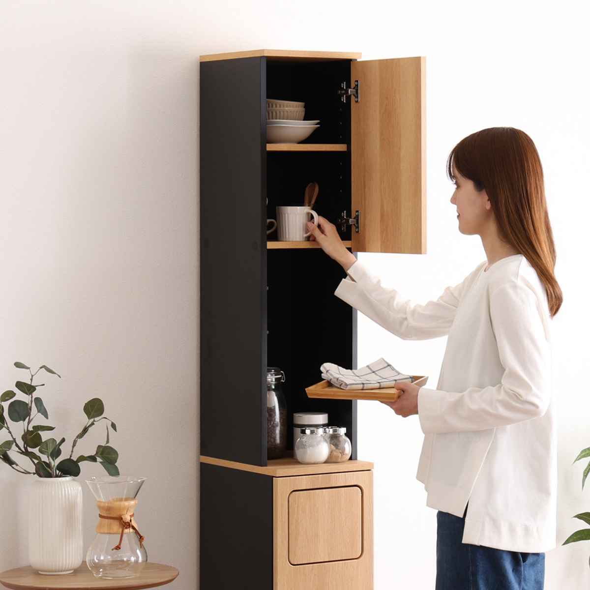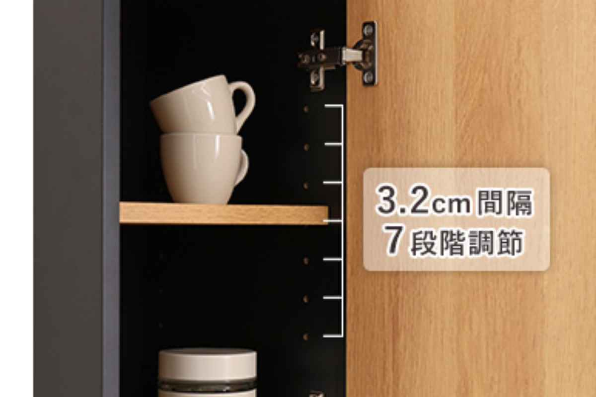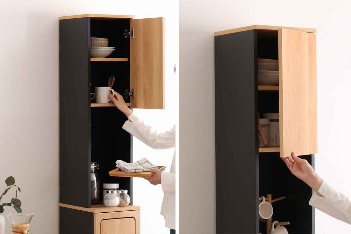 マグカップやプレートなどの食器、キャニスターや茶筒などのキッチン小物も保管可能です。扉を閉めると、生活感を隠しながらキッチンの印象をスマートに演出できます。