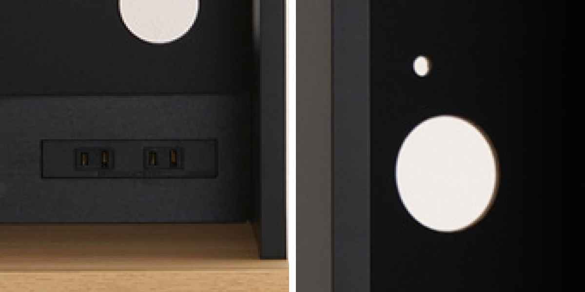 オープン収納部分に2口コンセントが付いているので、家電製品の配線がキレイに収まります。配線穴はコードを裏に通すことができ、まとまりにくい配線もスッキリとした印象になります。