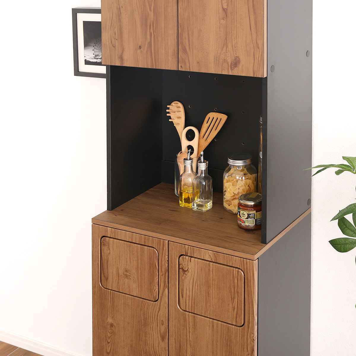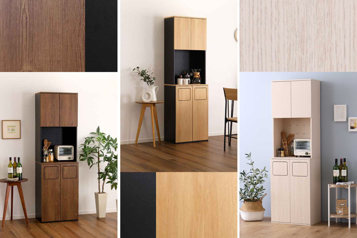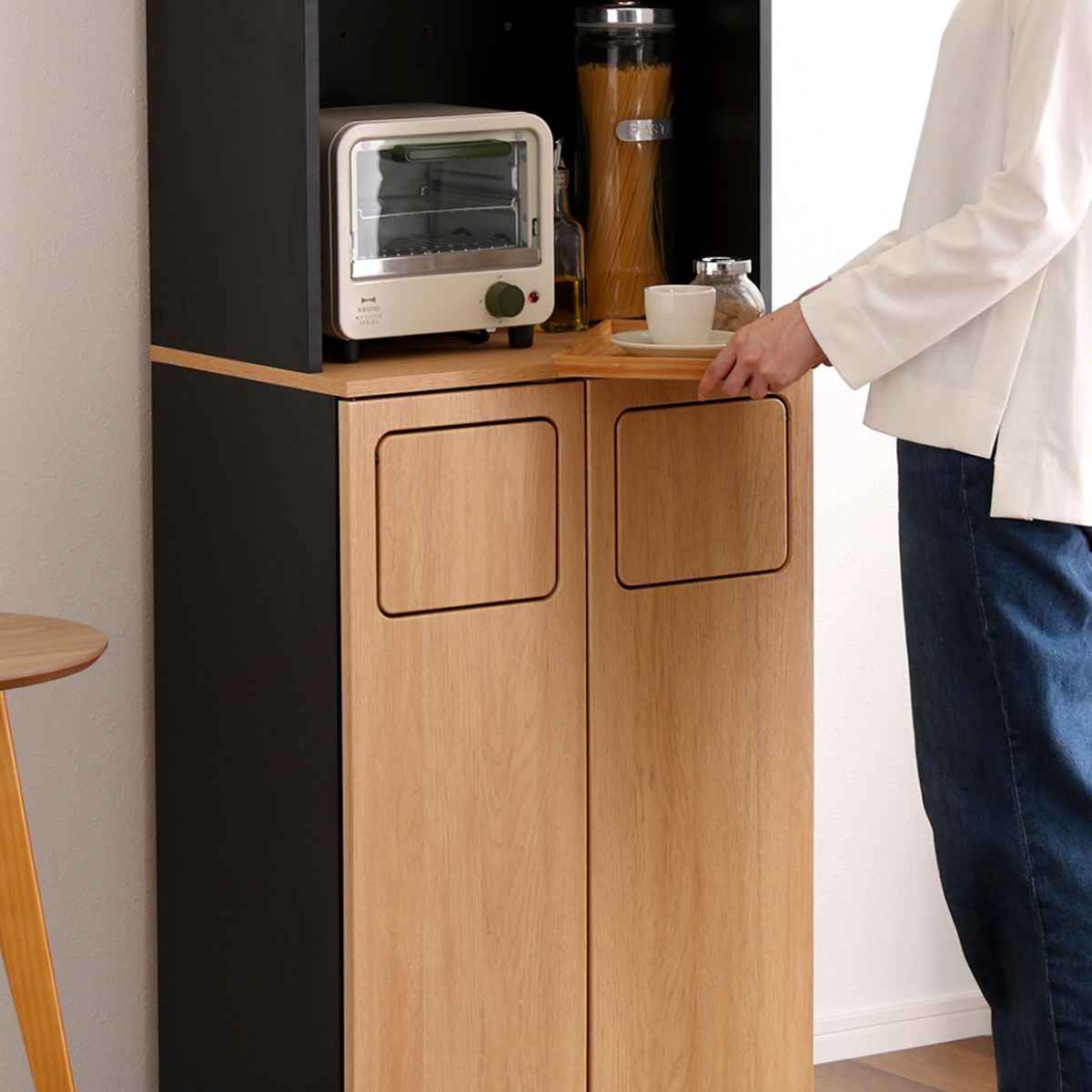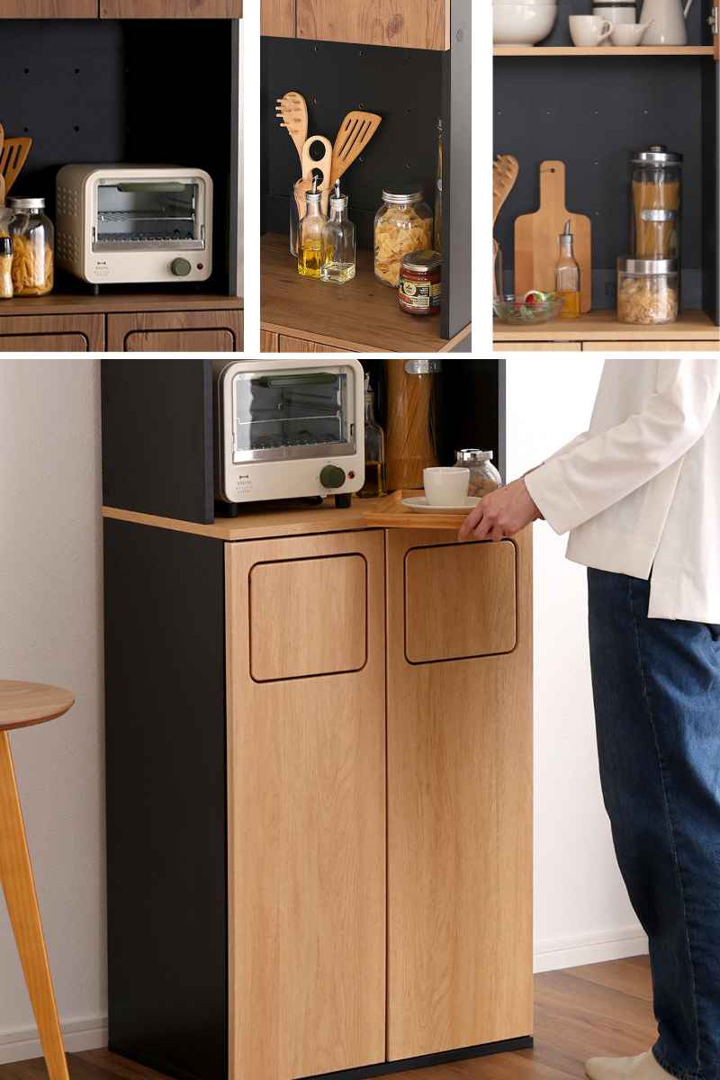 ゴミ箱上の空間を収納として利用でき、デッドスペースを有効活用できます。キッチン周りの収納や家電、ゴミ箱のスペースもこれ一台でスッキリまとまります。
