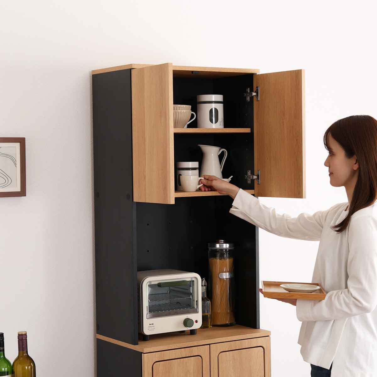 マグカップやプレートなどの食器、キャニスターや茶筒などのキッチン小物も保管可能です。扉を閉めると、生活感を隠しながらキッチンの印象をスマートに演出できます。