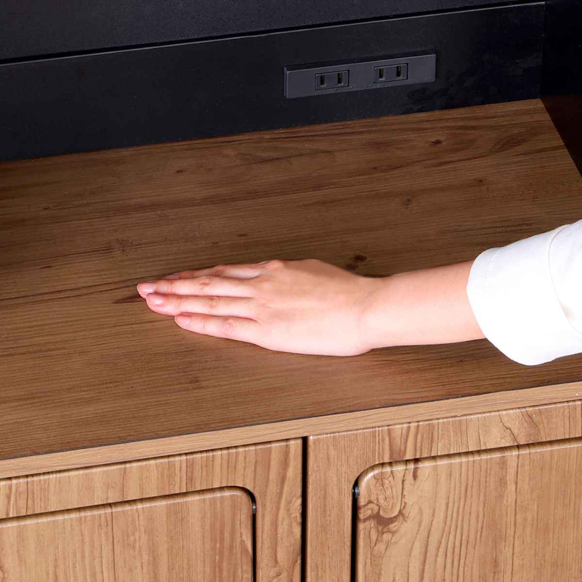 オープン収納部分に2口コンセントが付いているので、家電製品の配線がキレイに収まります。配線穴はコードを裏に通すことができ、まとまりにくい配線もスッキリとした印象になります。