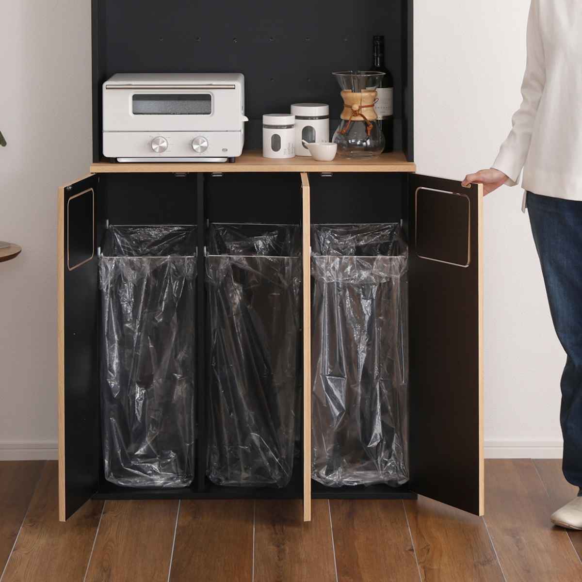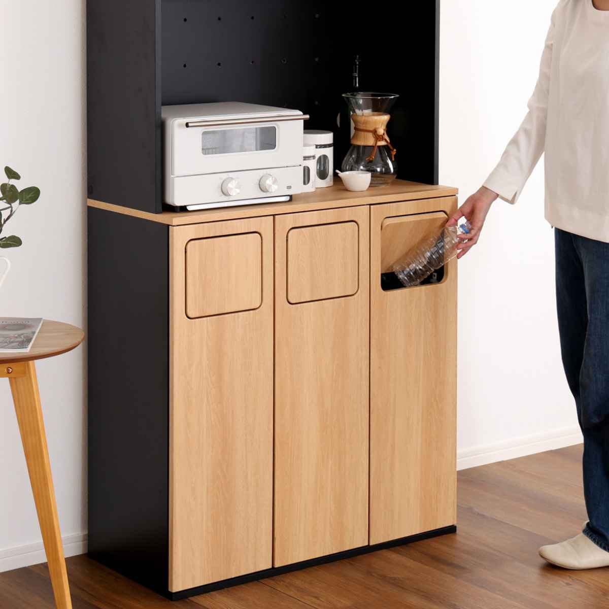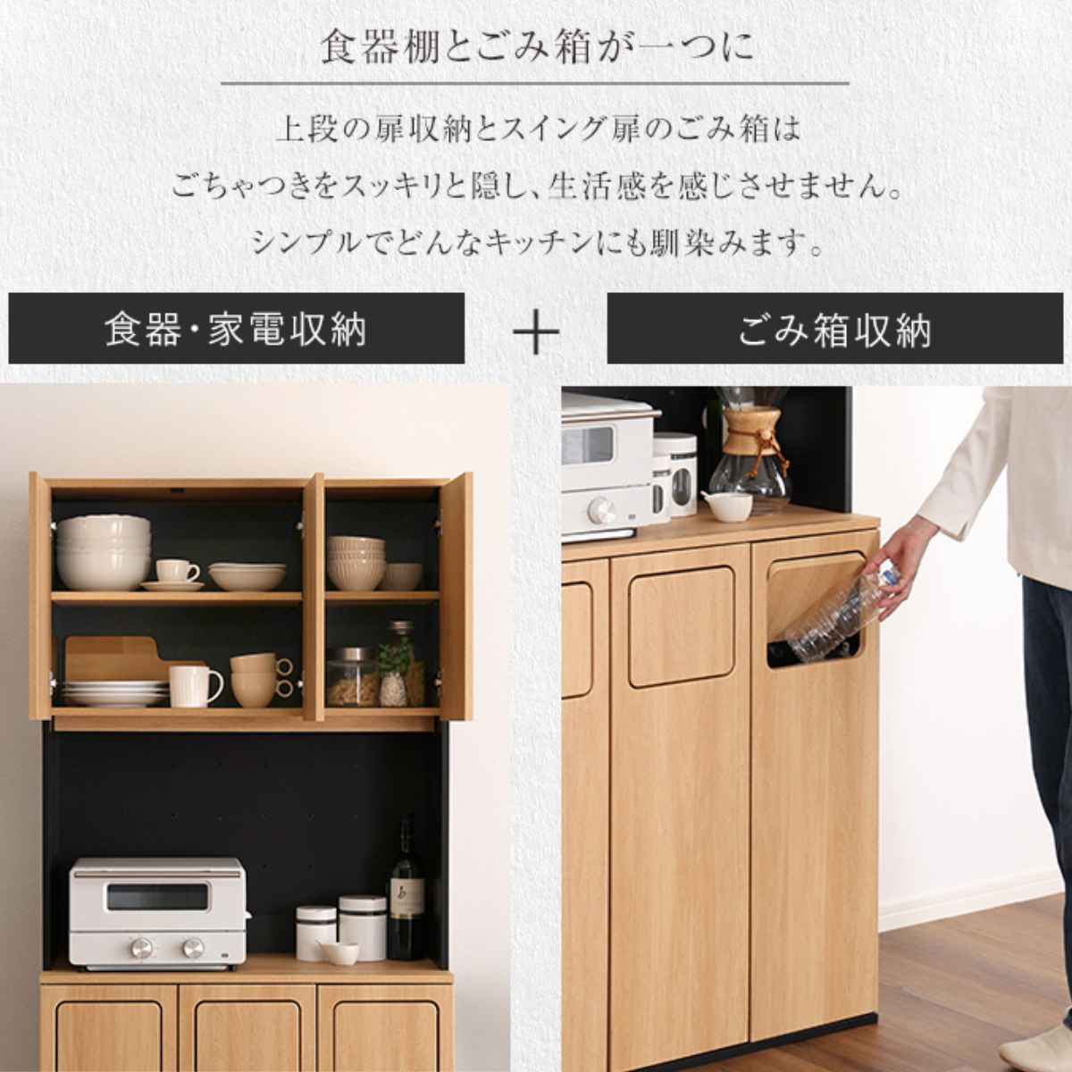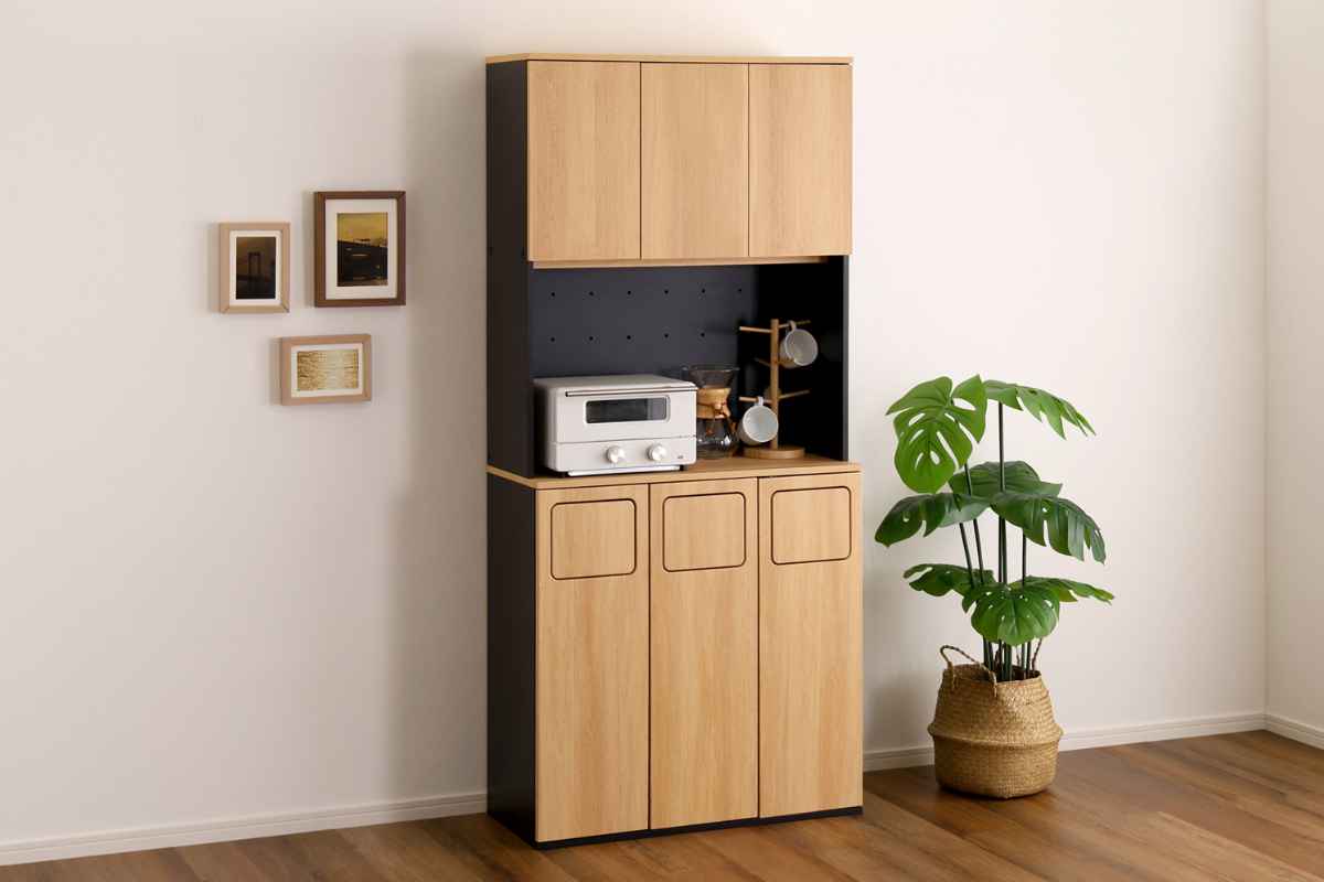 食器棚とゴミ箱の一台二役。ゴミ箱一体型食器棚です。まるで家具のようなデザインは、一見ゴミ箱に見えません。「生活感を隠したい」「オシャレに収納したい」そんな思いに寄り添うアイテムです。