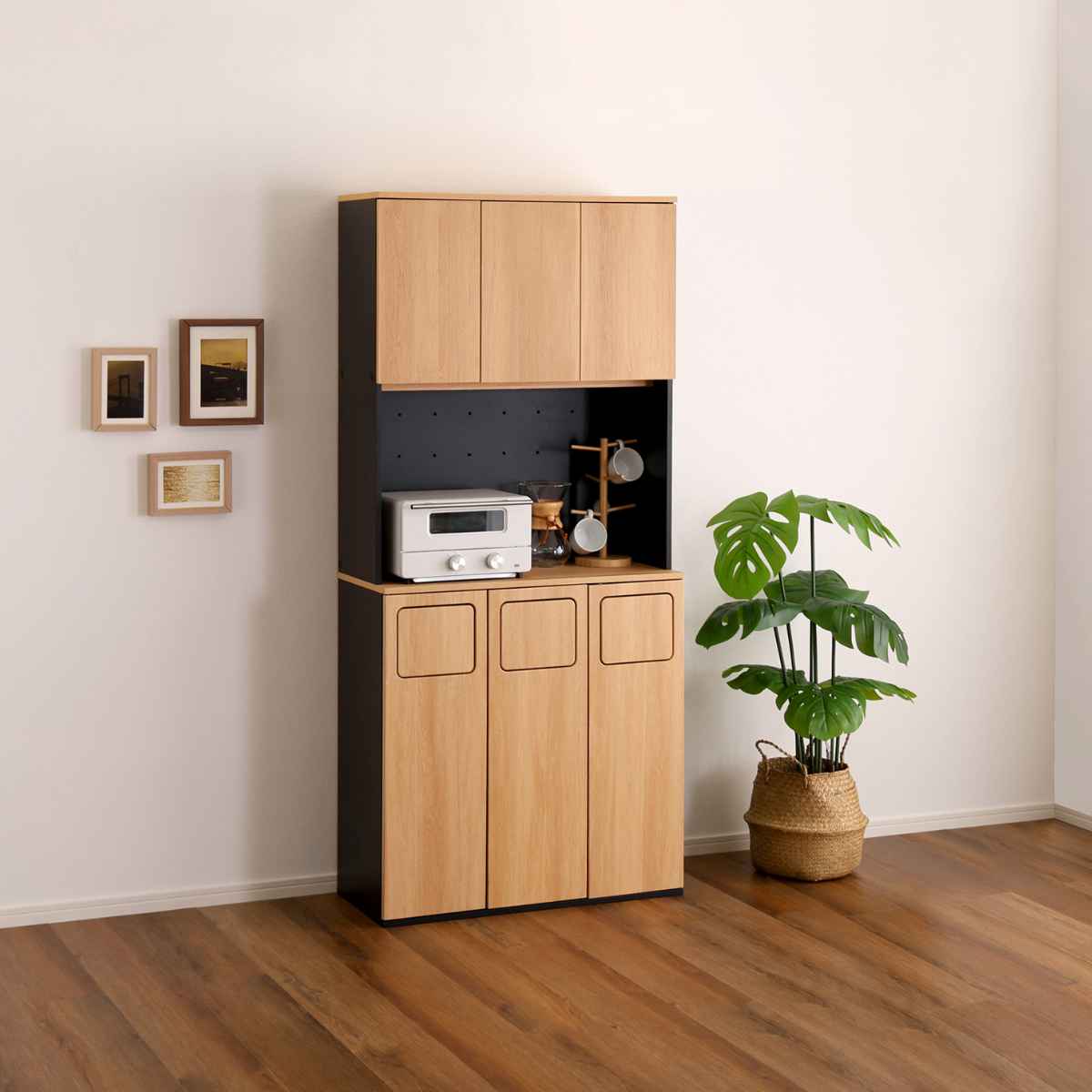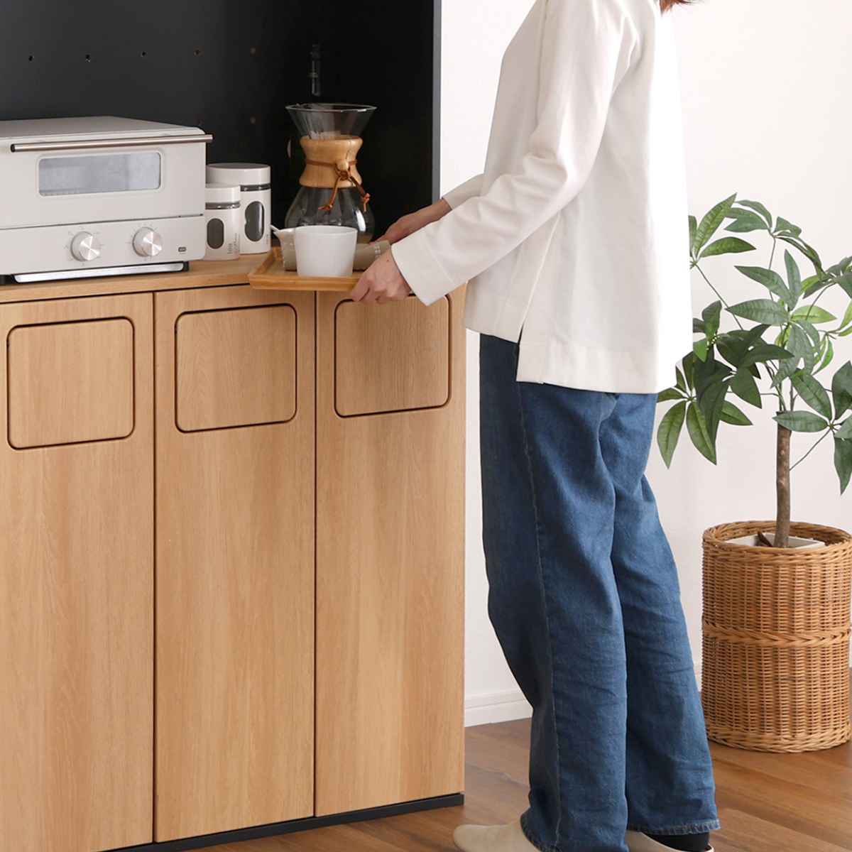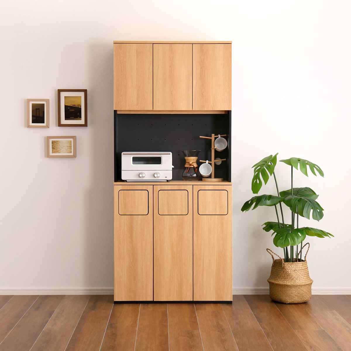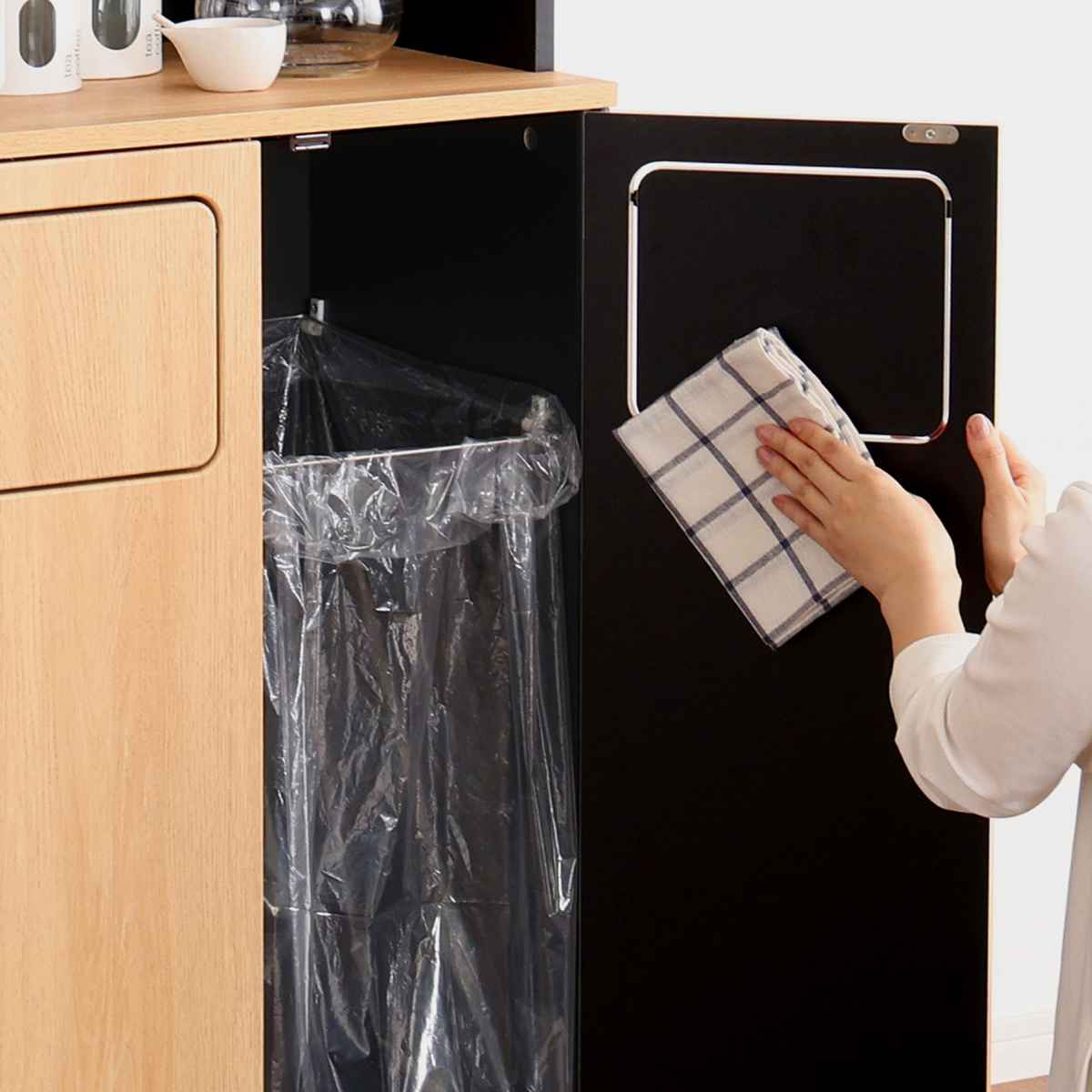 食器棚とゴミ箱の一台二役。ゴミ箱一体型食器棚です。まるで家具のようなデザインは、一見ゴミ箱に見えません。「生活感を隠したい」「オシャレに収納したい」そんな思いに寄り添うアイテムです。