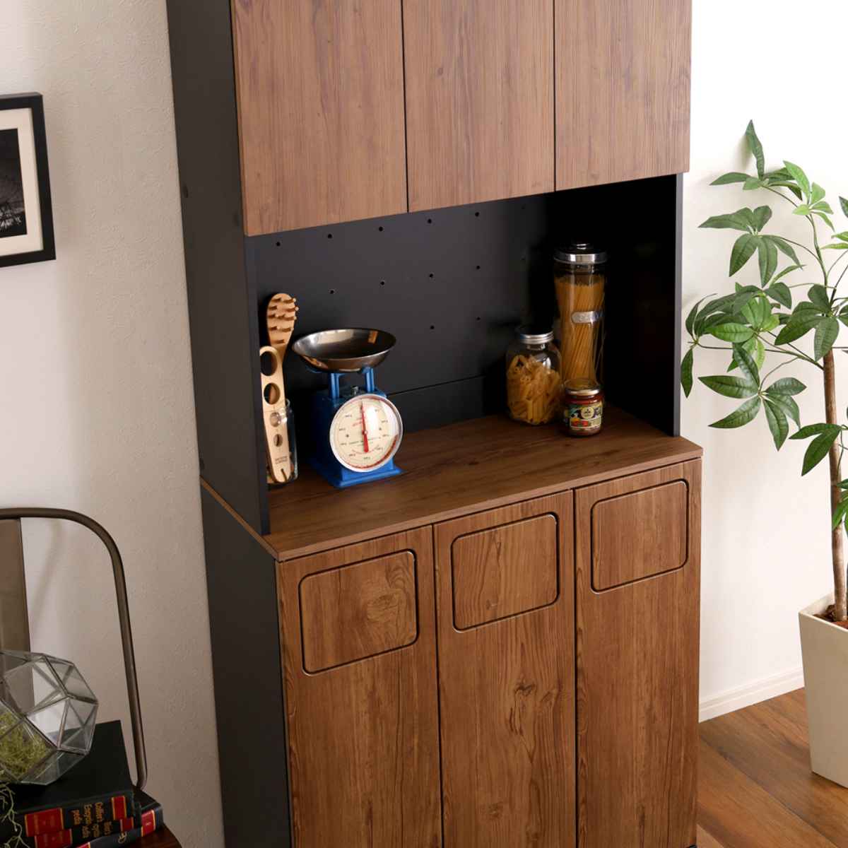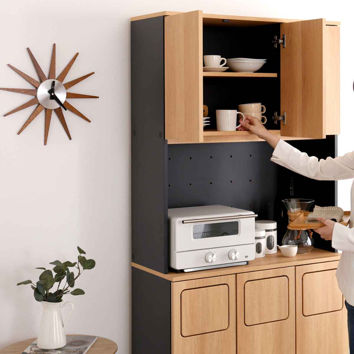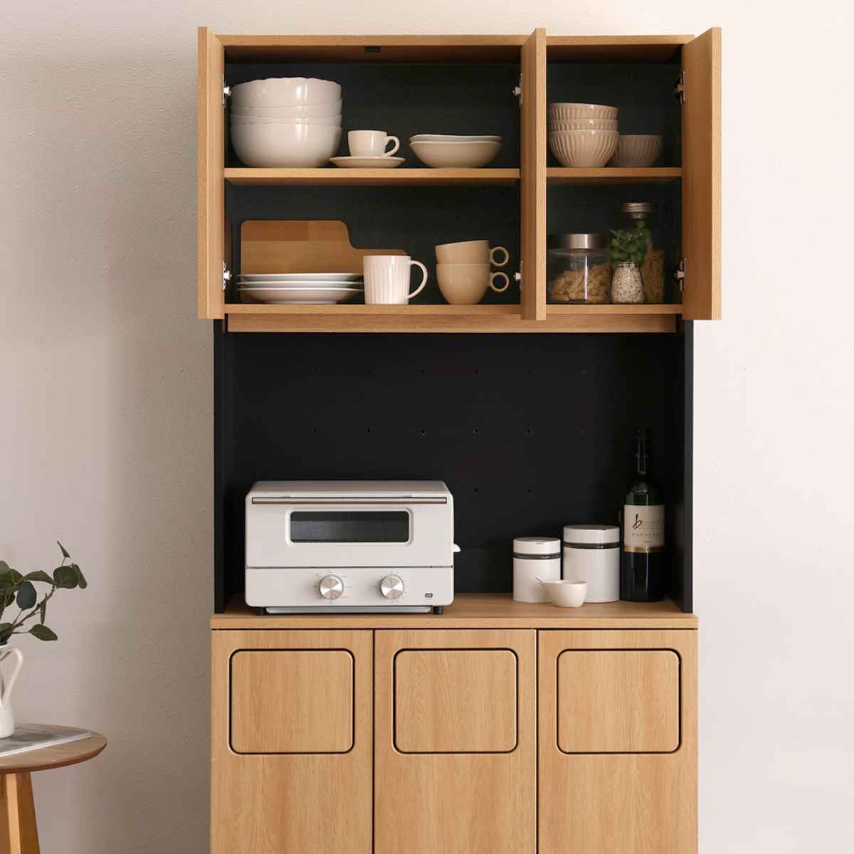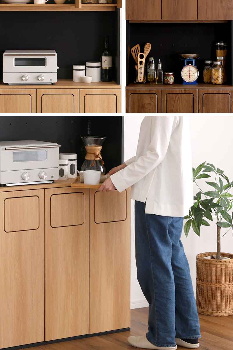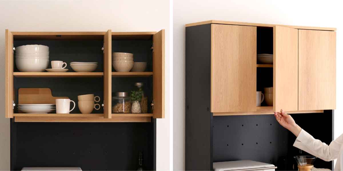 マグカップやプレートの食器類、キャニスターやティーポットなどのキッチン小物も保管可能です。扉を閉めると、生活感を隠しながらキッチンの印象をスマートに演出できます。