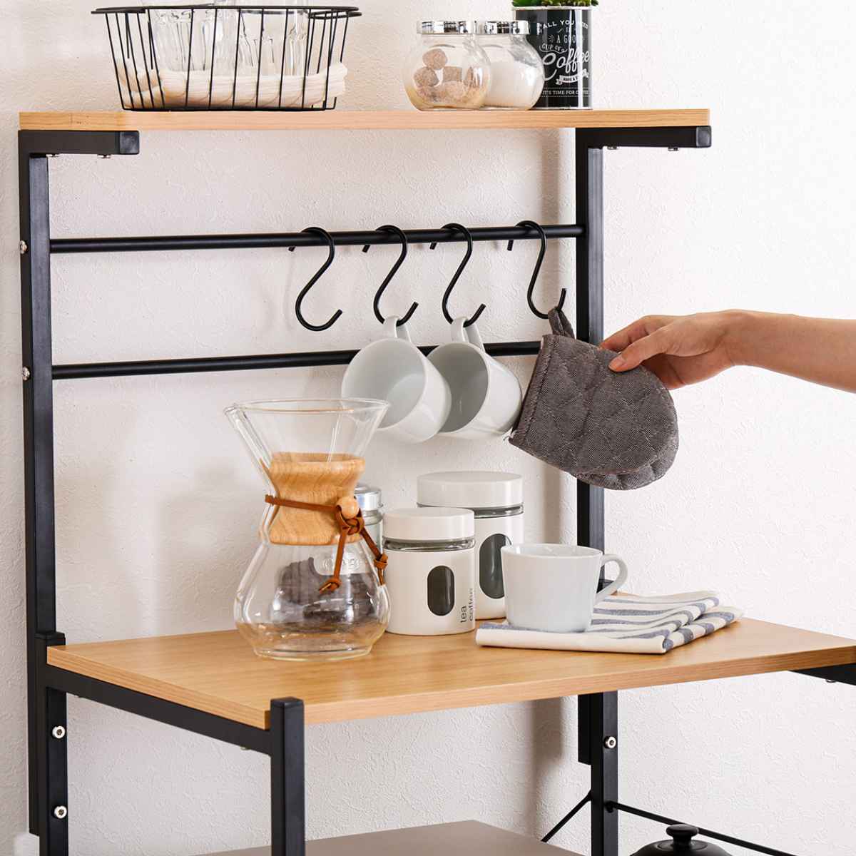 S字フックが4個付属しているので、コップやキッチンミトン、ドライヤーなどを引掛けて収納するのにぴったりです。