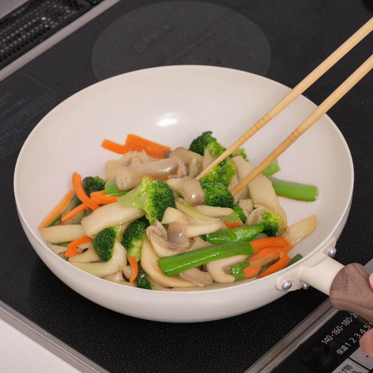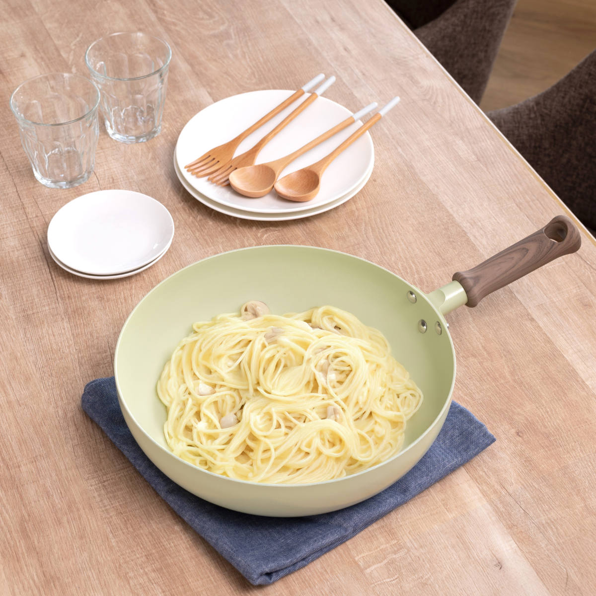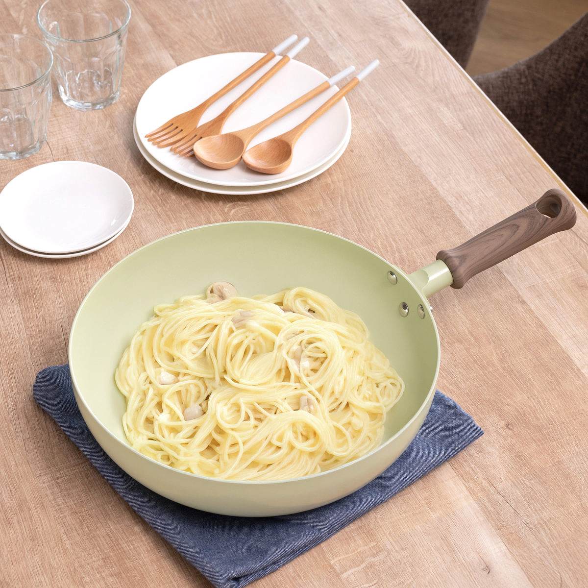 IHクッキングヒーター・ガスコンロどちらにも対応しています。深さがあるので食材が飛び出しにくく、炒め物も快適に作れます。また、フライパンひとつでパスタを作るワンパン料理にも最適で、ソースも絡めやすく周囲を汚しません。