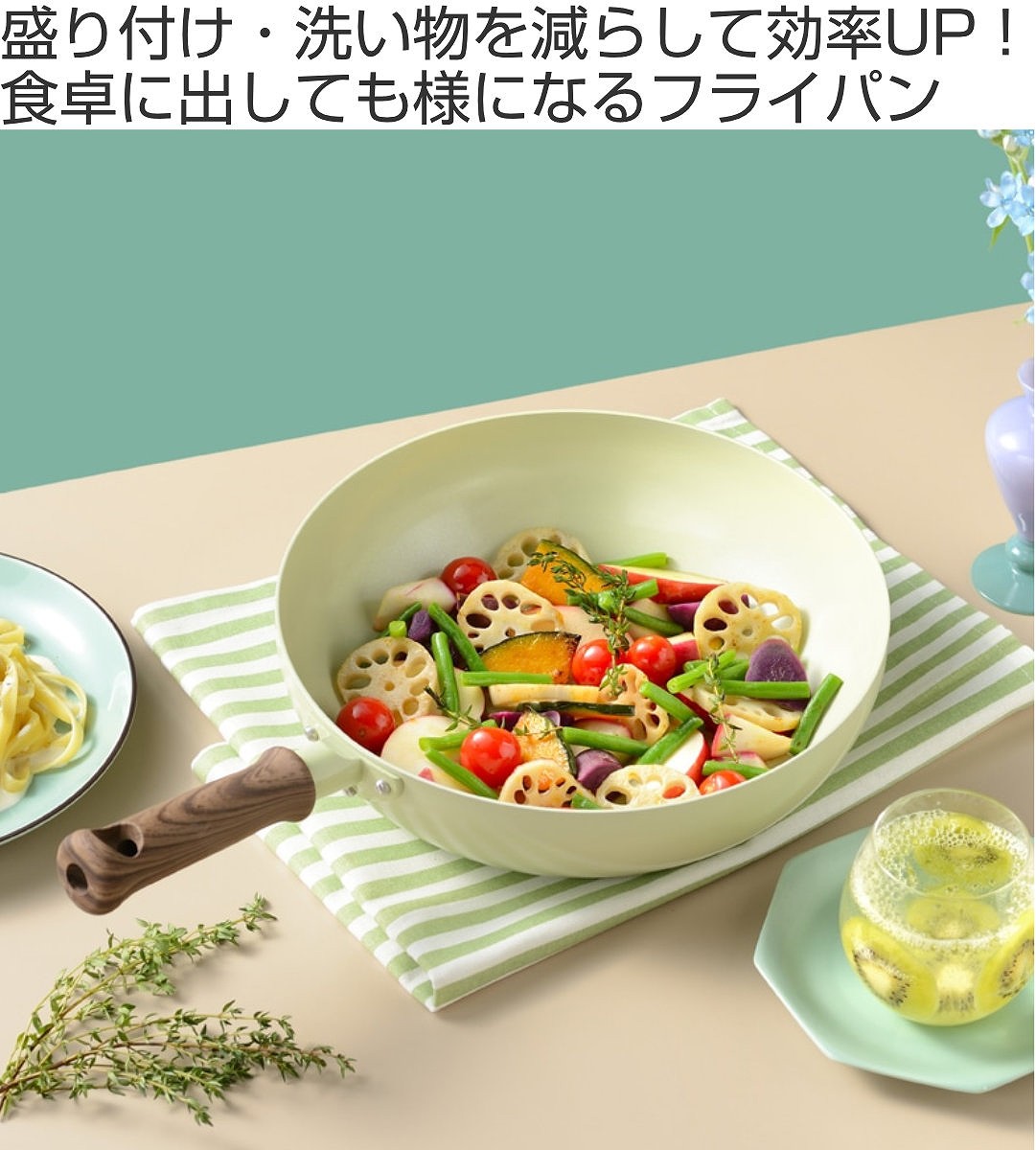 調理から盛り付けまでこれひとつでOK!大皿感覚で使えるフライパンです。食卓でも使いやすいよう、ハンドルはショートに。ひとりでパッと済ませたいランチから、友人を招いてのホームパーティ、家族団欒の食卓まで、盛り付けや洗い物の手間をカットして効率よく活躍します。