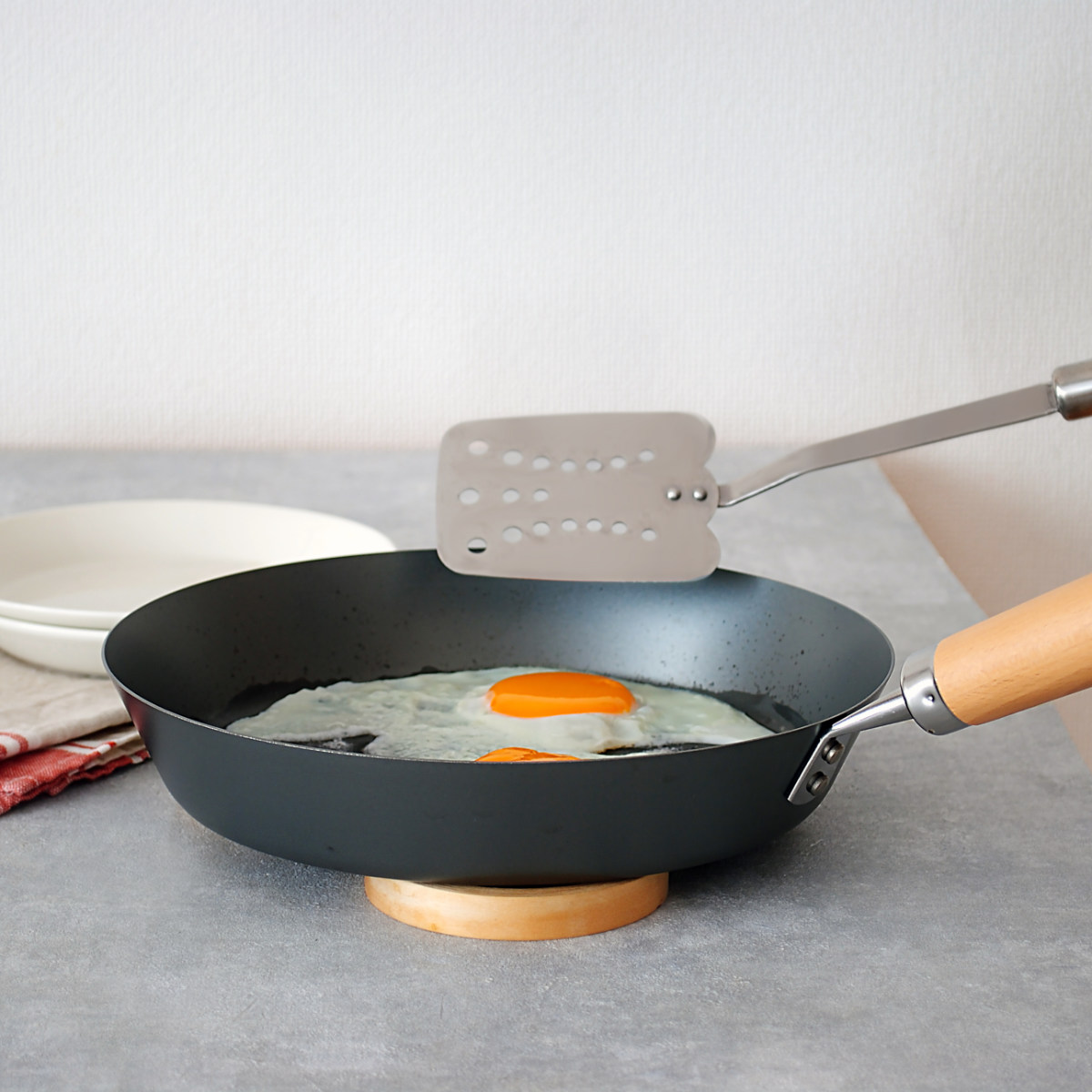 一般的な鉄フライパンに必要とされる、使いはじめの「空焼き」や使用後に油を塗って保管する「油引き」が必要ありません。そのため重ねて収納することも可能です。後片付けが楽なので、使うハードルがぐっと下がります。