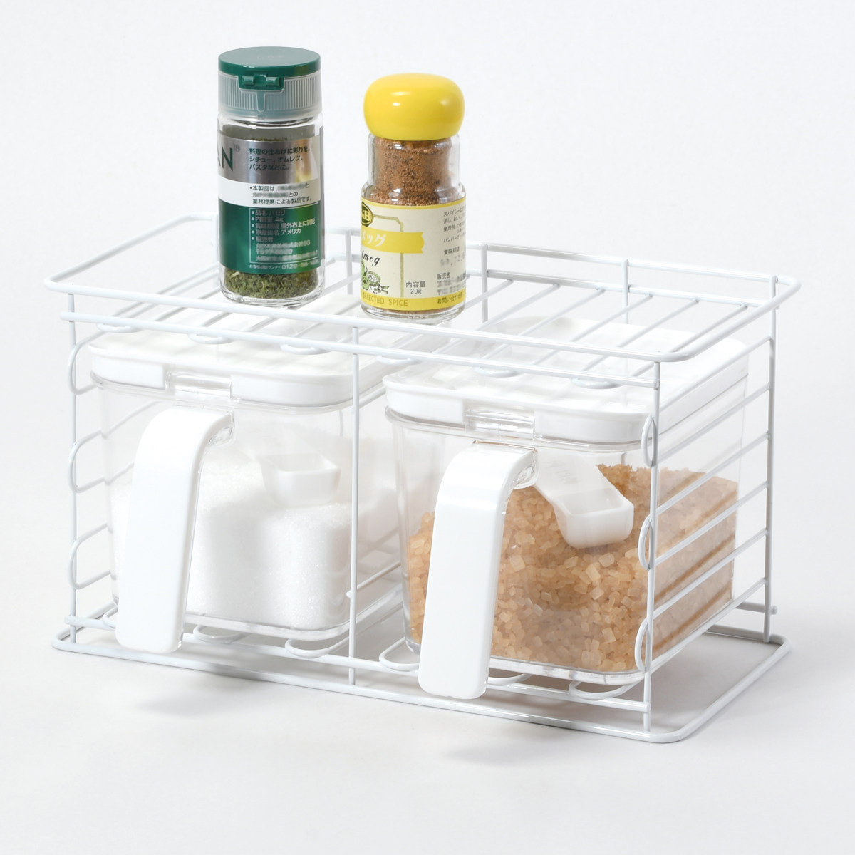 毎日のお料理に欠かせない調味料をスッキリと収納できる、調味料ストッカー2個と専用ラックのセットです。ストッカーには料理によく使う砂糖や塩などを保存でき、ラックの上段にはスパイス類を置いていただけます。