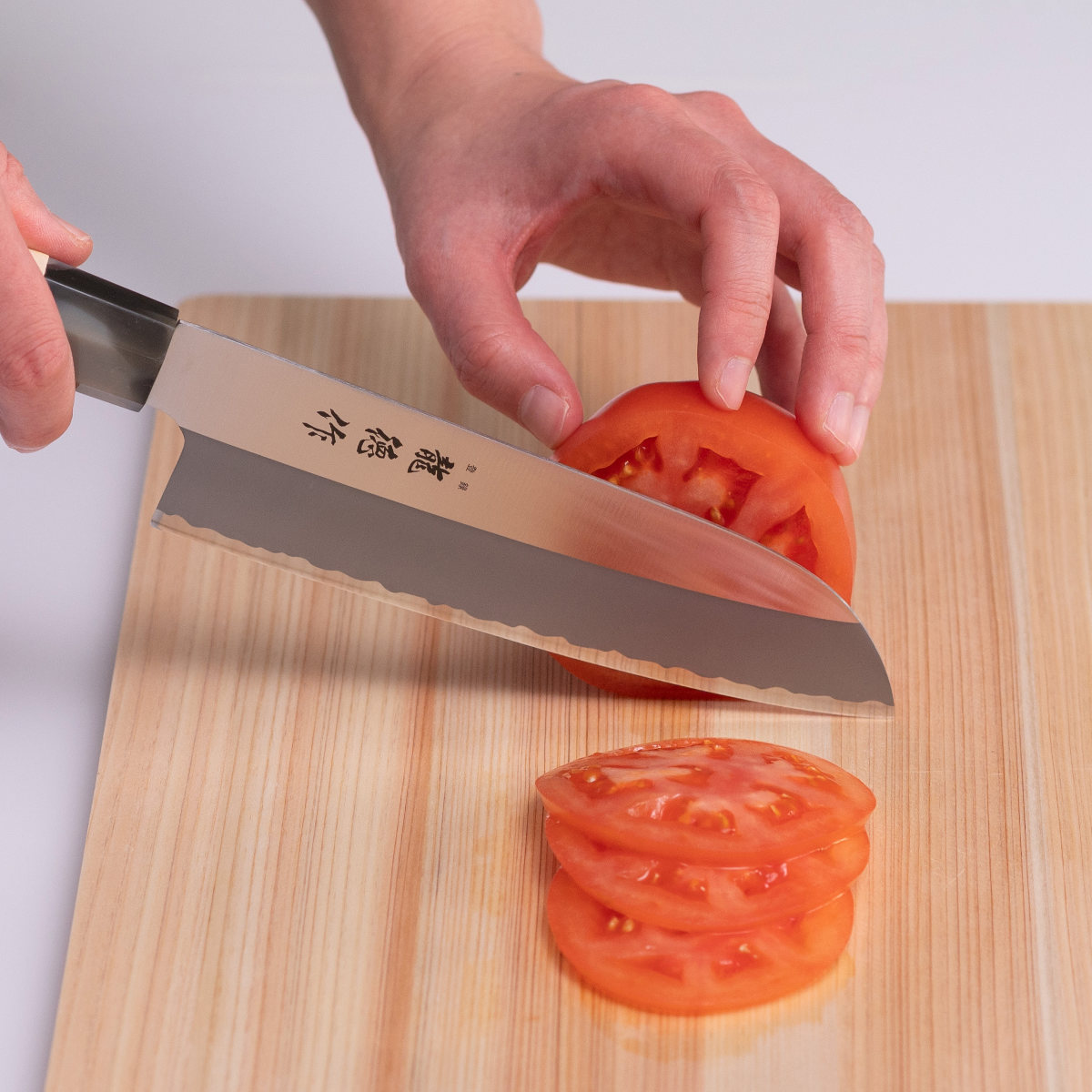刀身には切れ味抜群のステンレス刃物鋼を使用しています。形を崩しやすい食材も、スパッと美しい断面でカットできます。