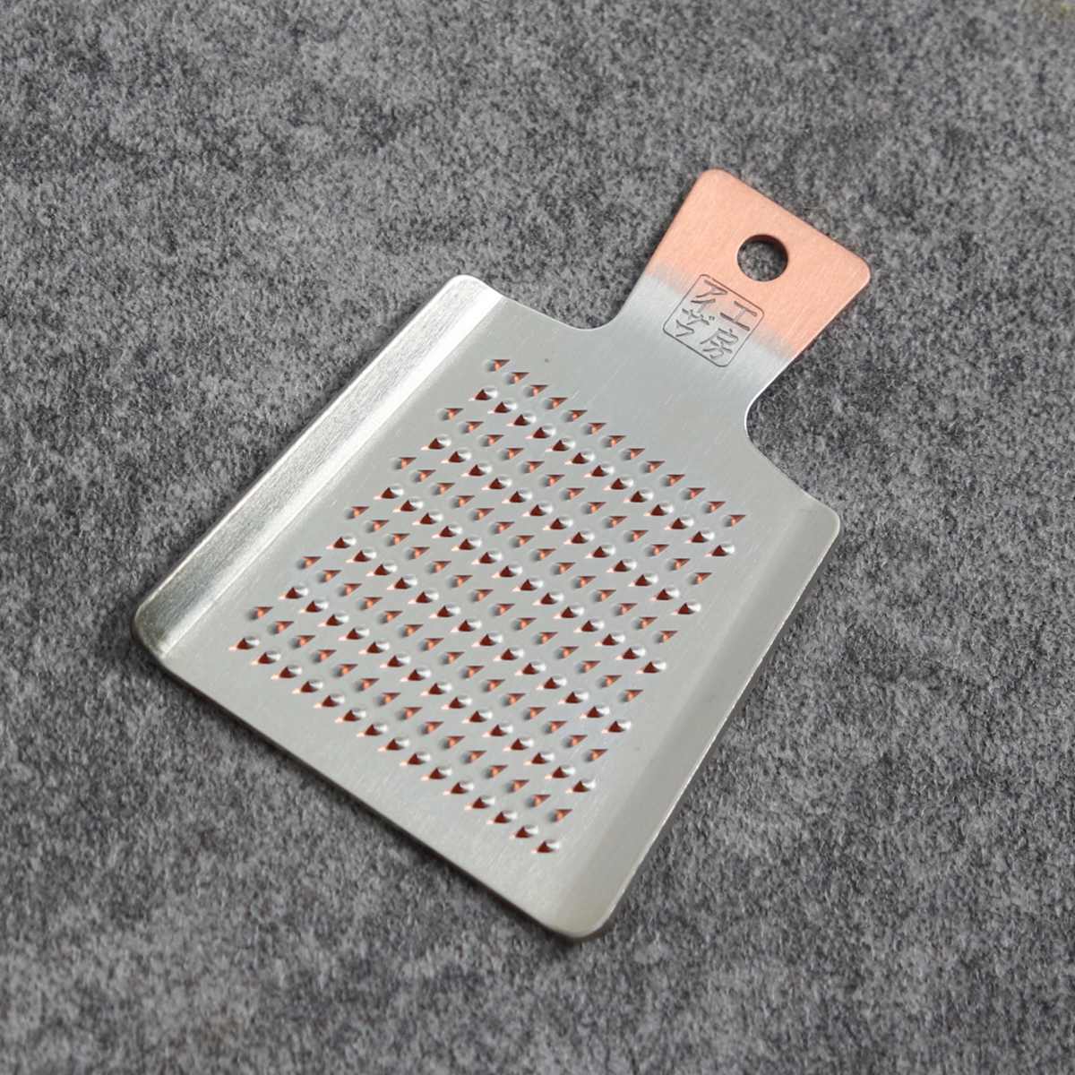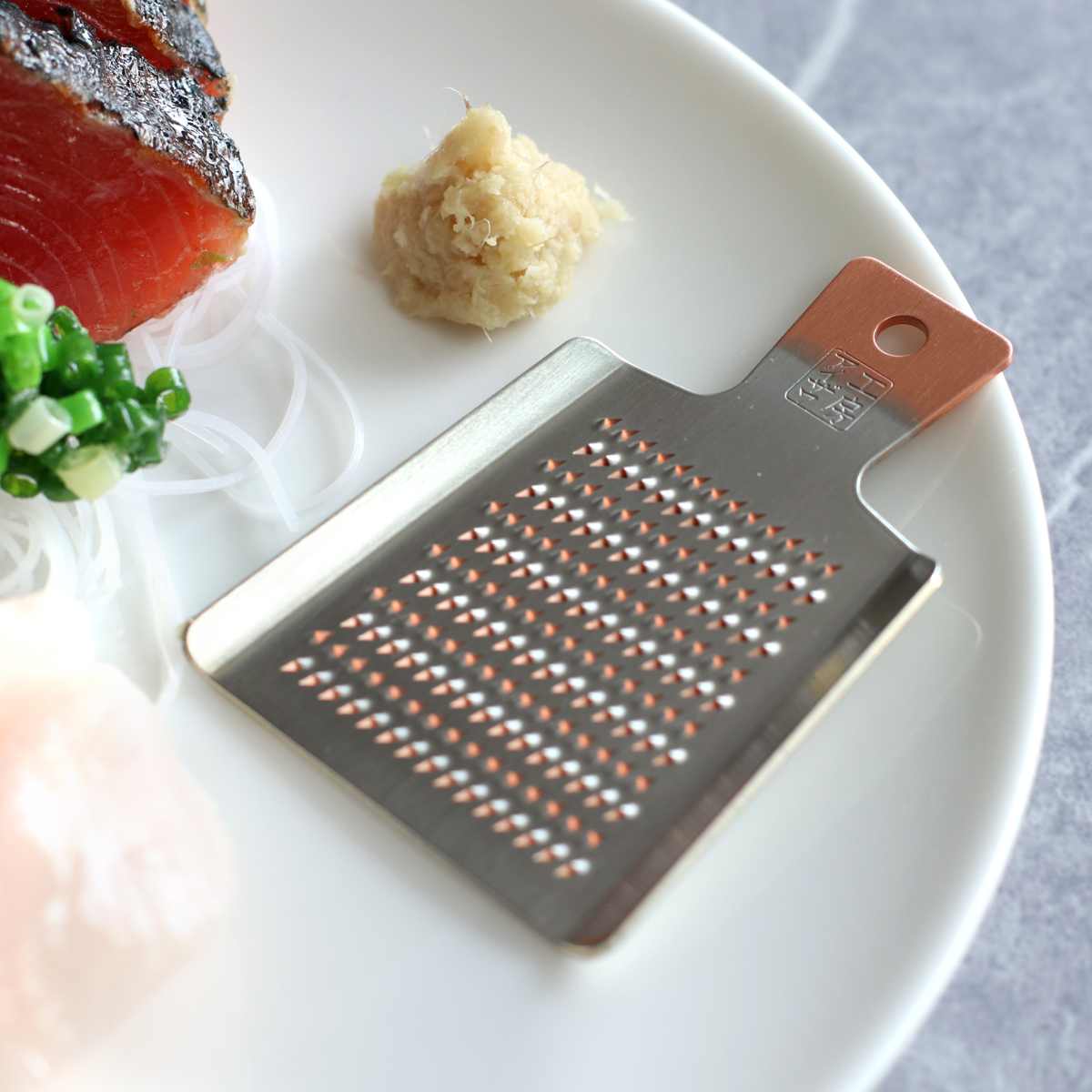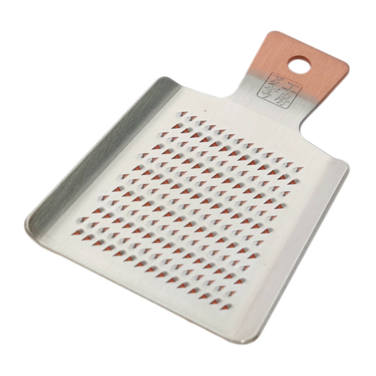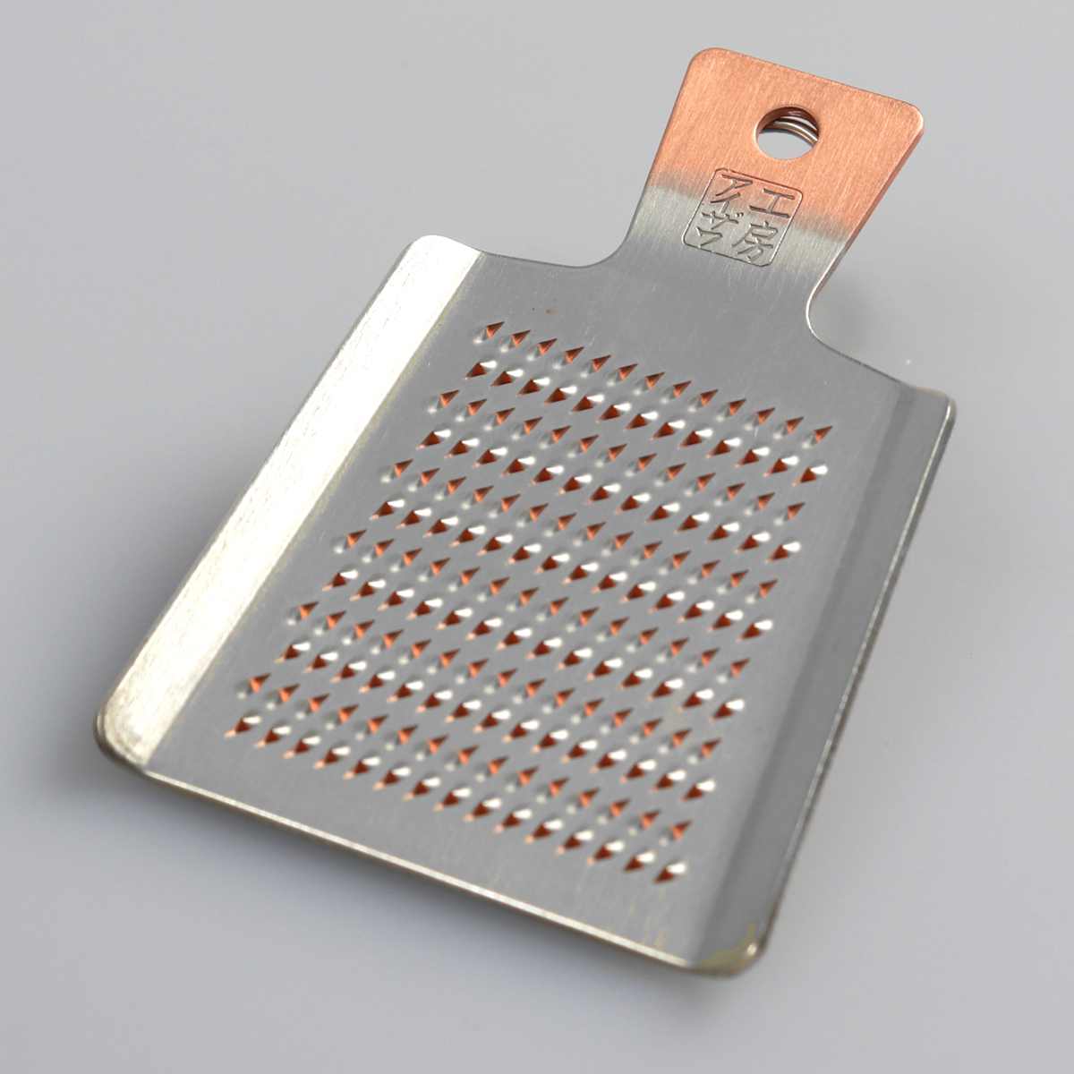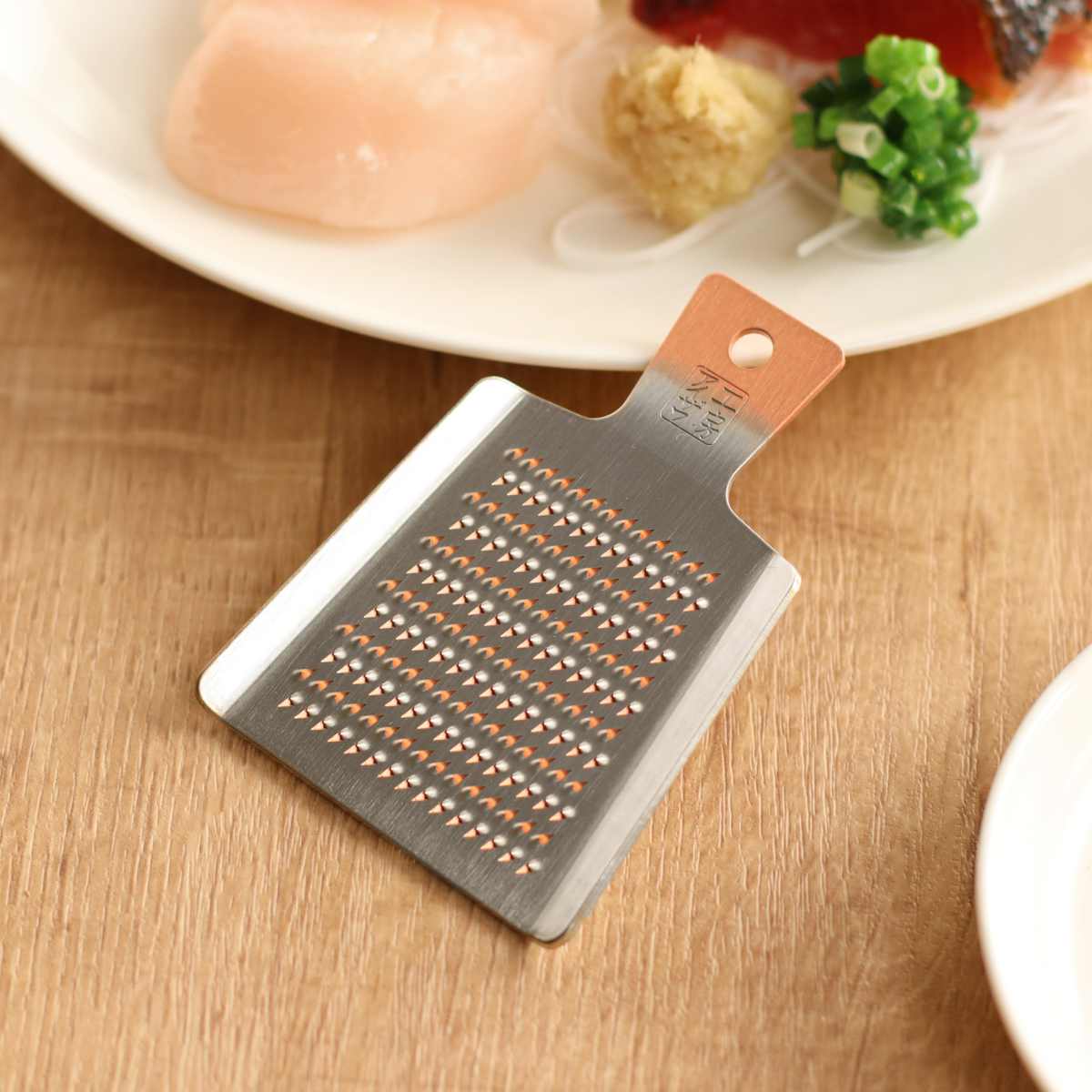 純銅製に錫めっきが施された耐久性と切れ味に優れた手のひらサイズのおろし金。長く愛用できる丈夫なおろし金は使う度に風合いが増し、自分仕様に変化していくことで愛着が湧き欠かせない道具になります。