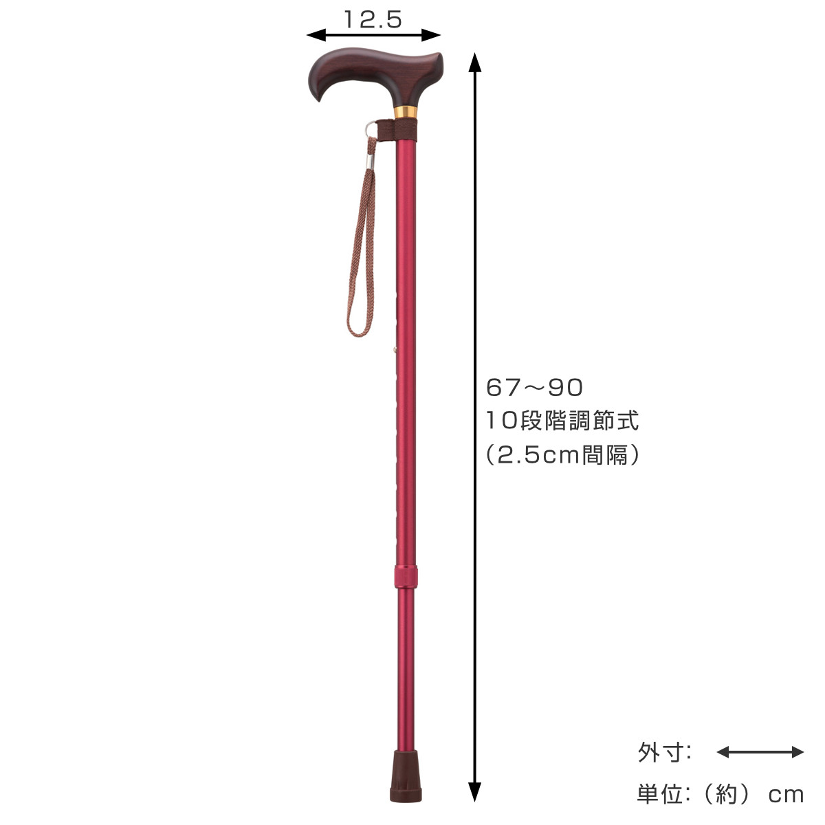 - 杖の長さ:約67~90cm(2.5cm間隔の10段階調節式)