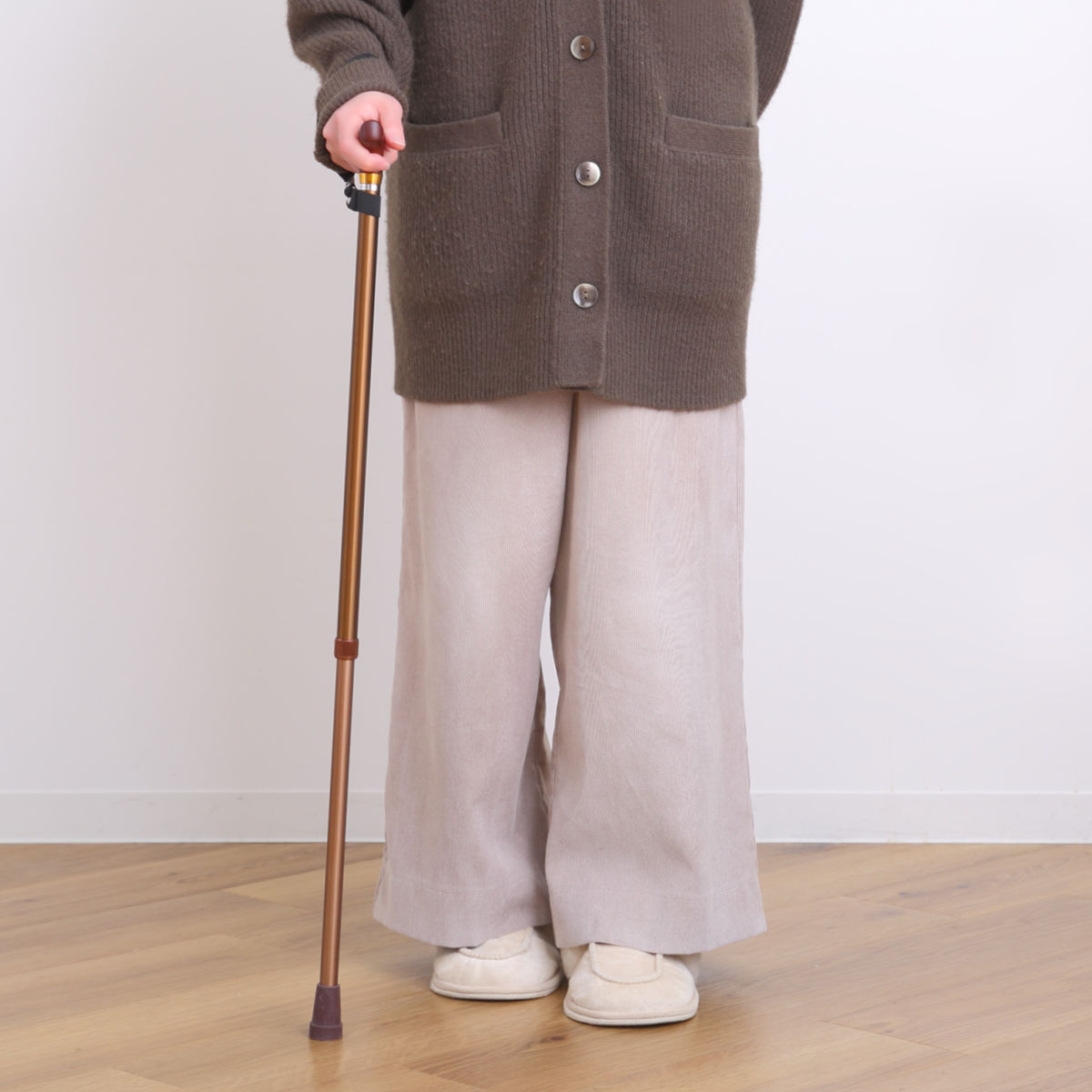 腕と杖が一直線になるように持ってください。グリップの一部だけを握ると不安定になり危険です。