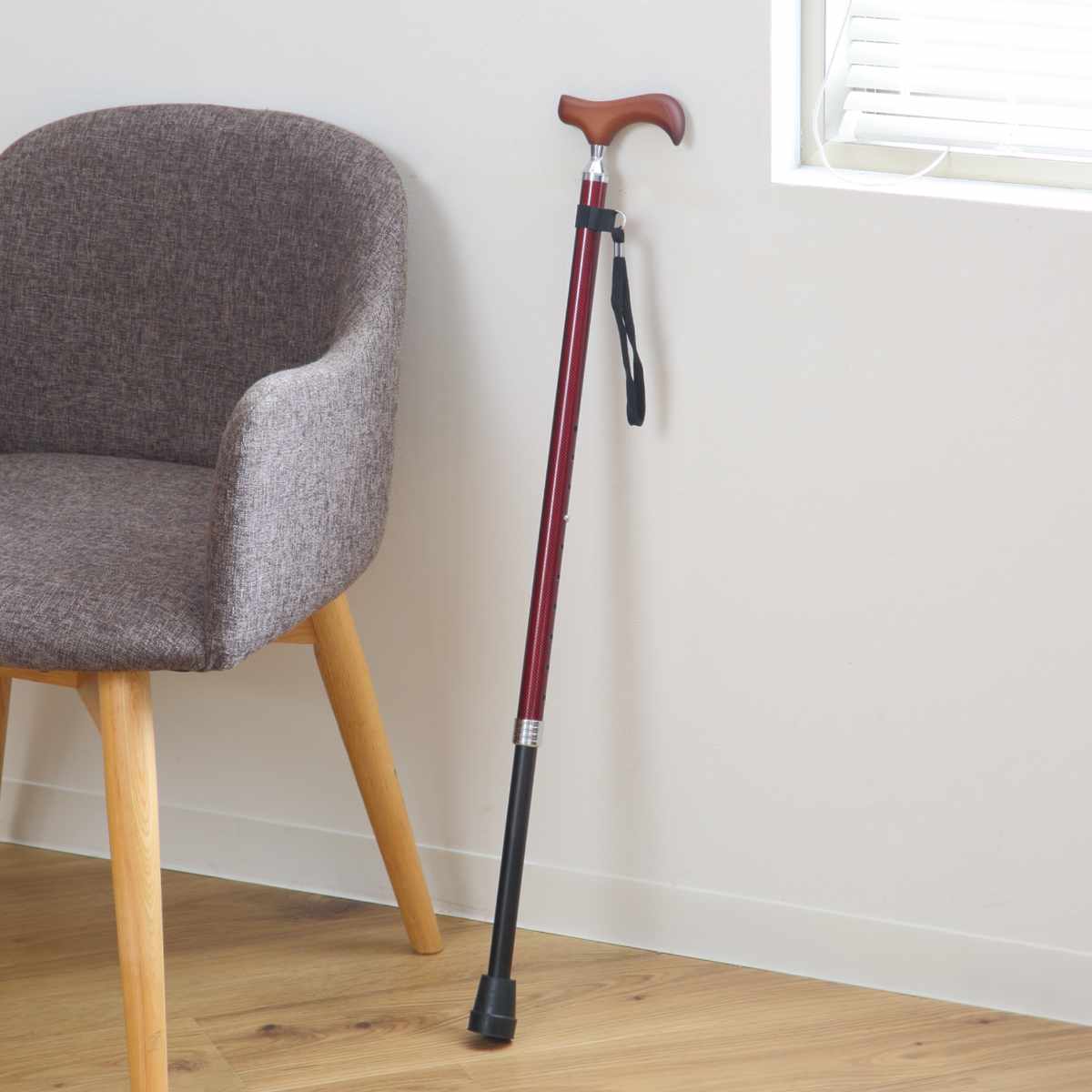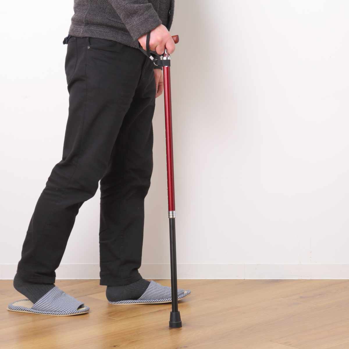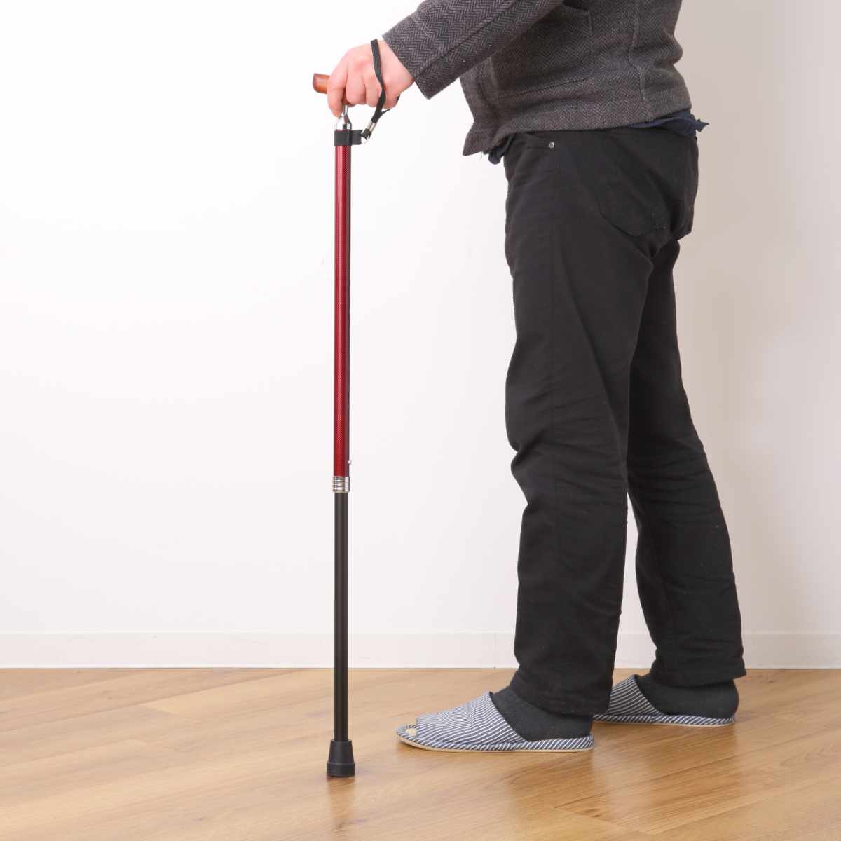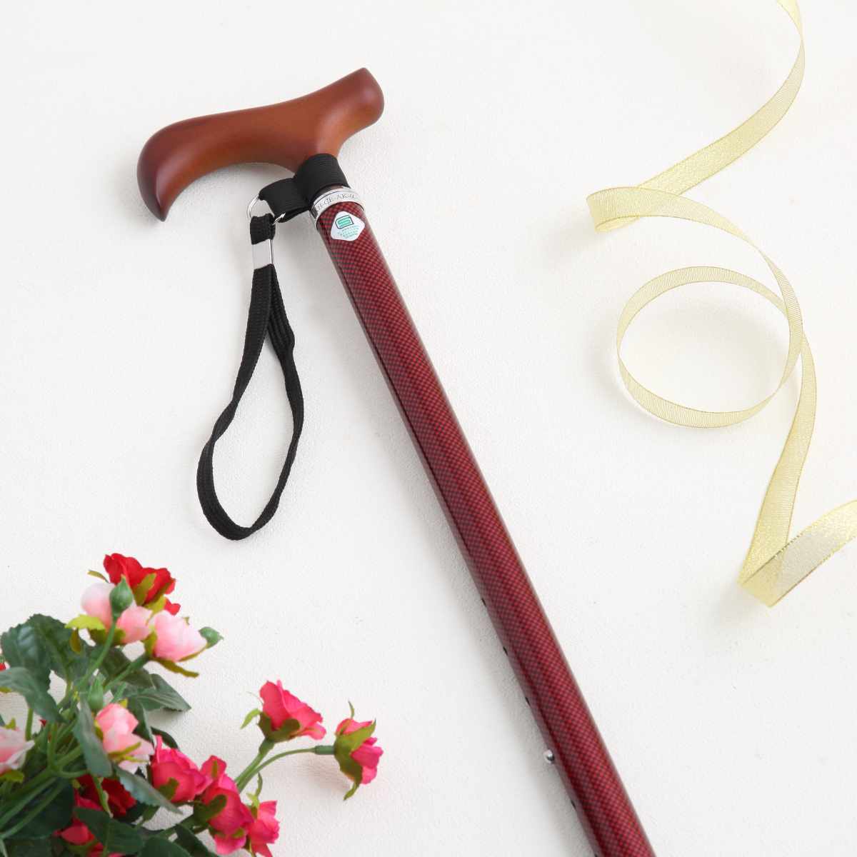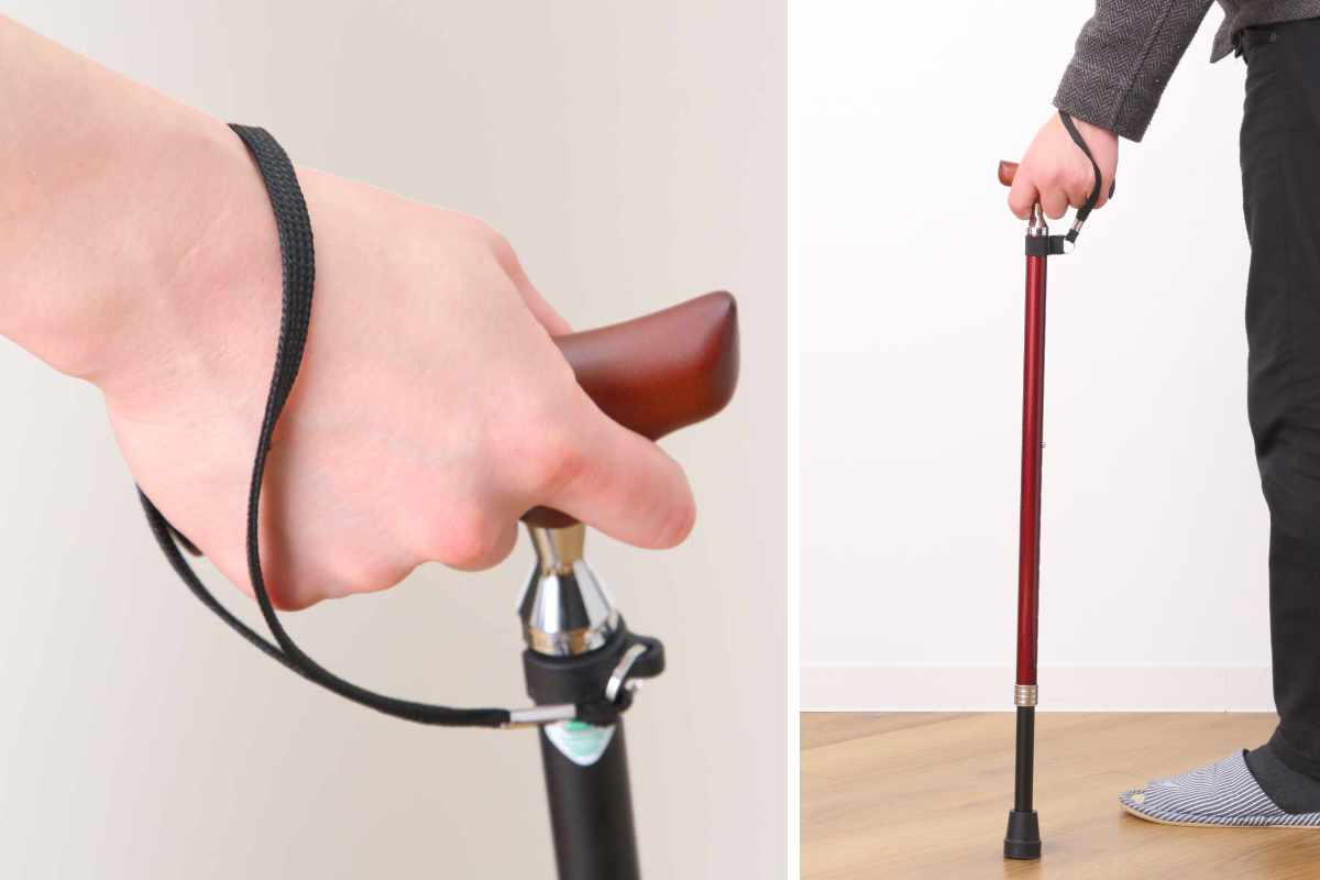 便利なストラップ付きです。手を離してもステッキが倒れず、拾う必要がないので便利です。ステッキを置き忘れたり、倒したりすることも少なくなります。