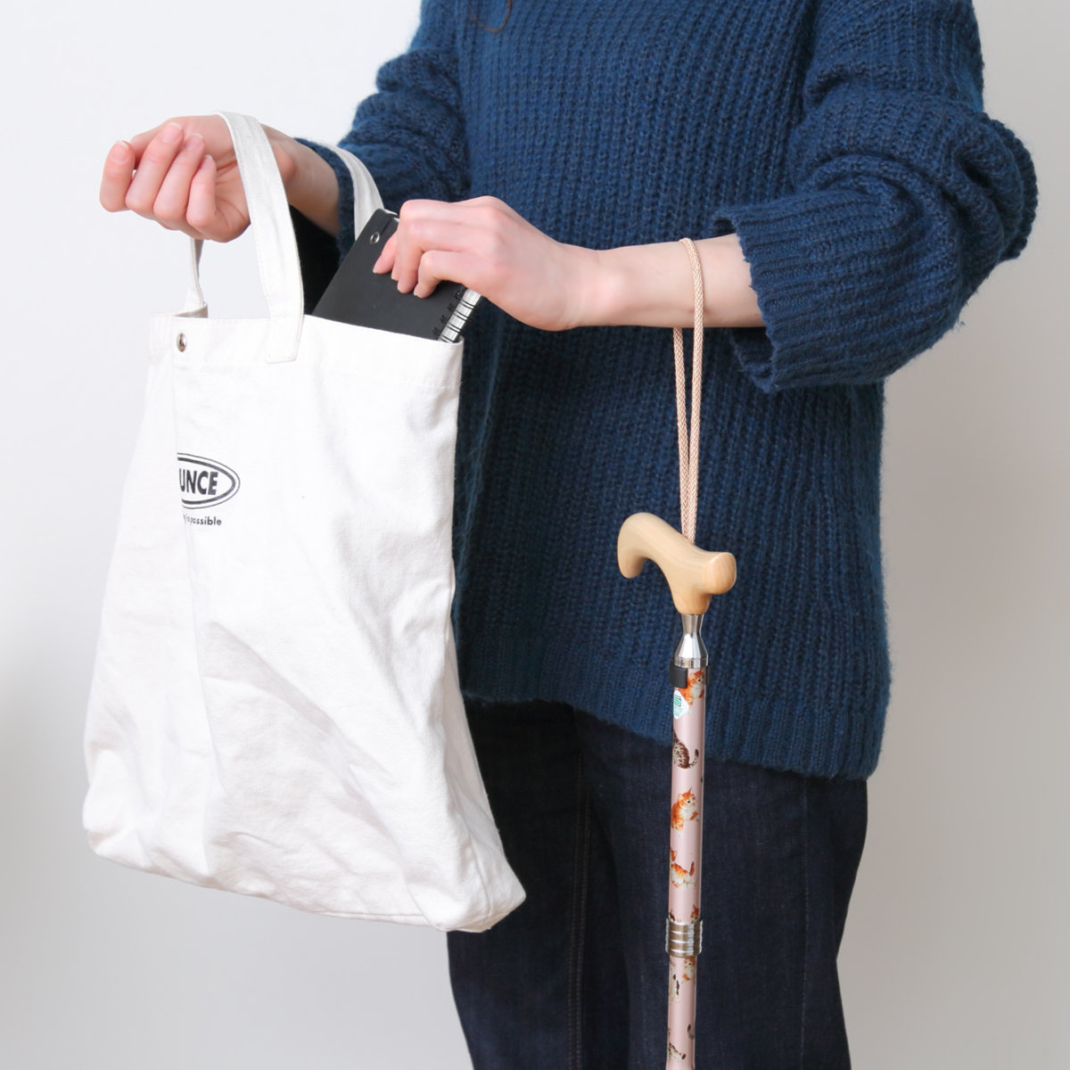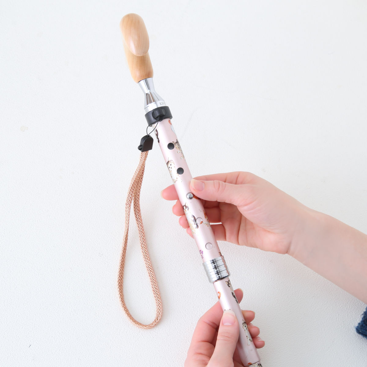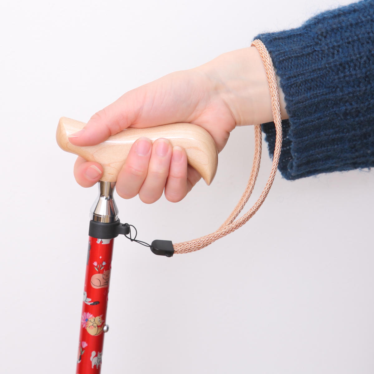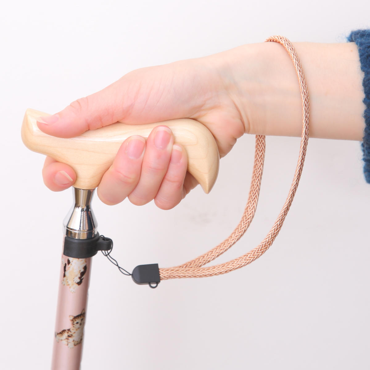 着脱しやすく上品な色味のストラップ付きです。手首に通せば両手が自由になり、杖の置き場所にも困りません。杖を置き忘れたり、倒したりすることも少なくなります。