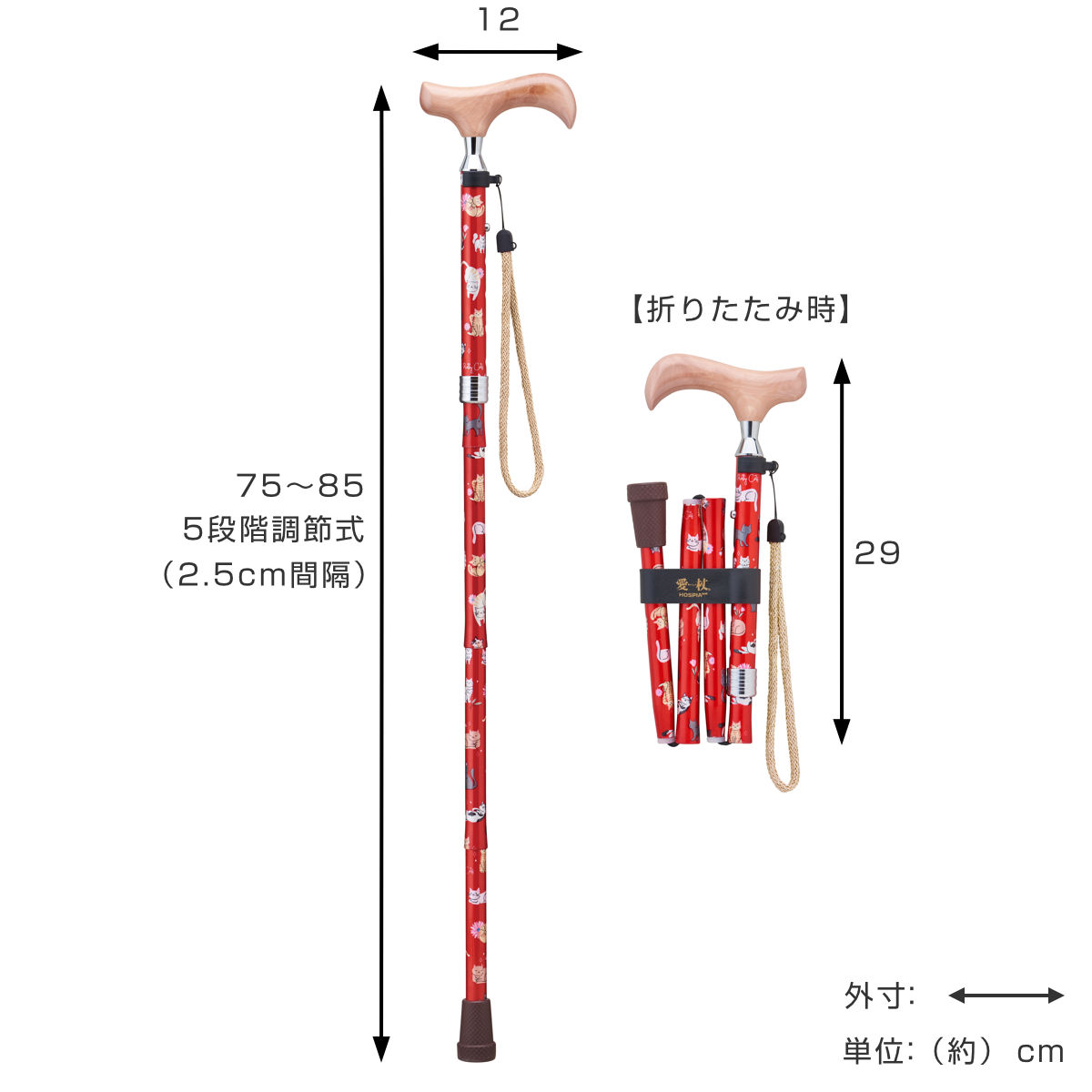 | サイズ | 杖の長さ:約75~85cm(2.5cm間隔の5段階調節式) 折りたたみ時:約29cm グリップの長さ:12cm 杖の上径:19mm 杖先ゴム:16mm(茶・ブラックのみ黒)/底径30mm |