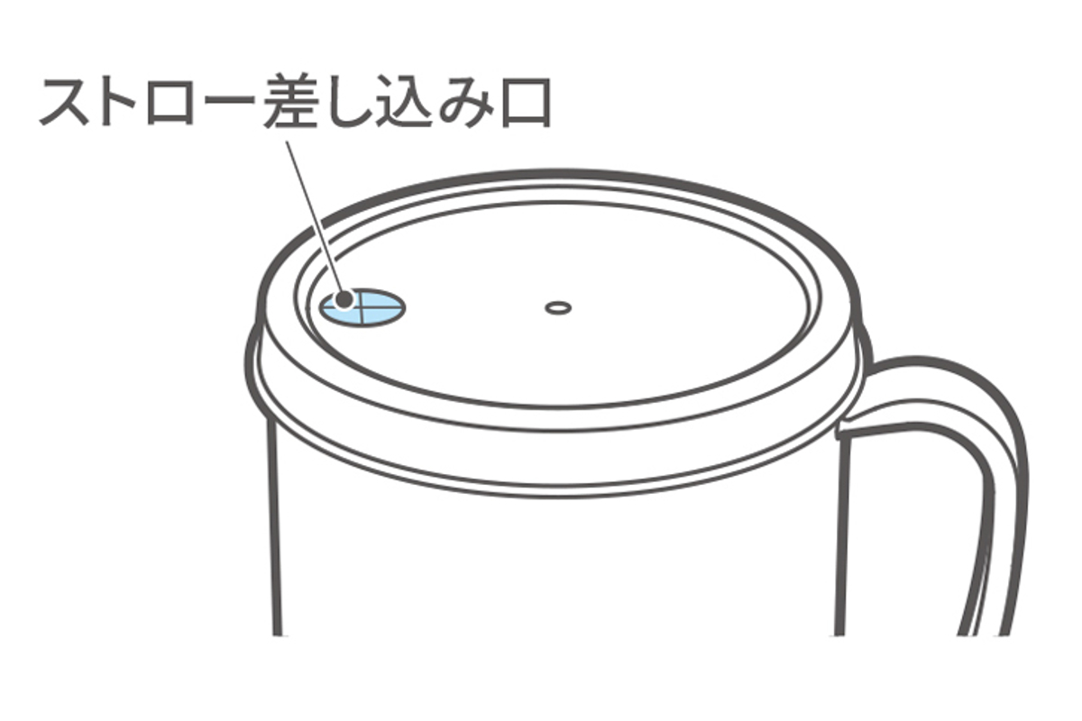 コップを傾けてもこぼれにくいフタ付きです。フタにはストロー専用の差込口が付いており、市販のストロー(直径6mmまで)を使用できます。