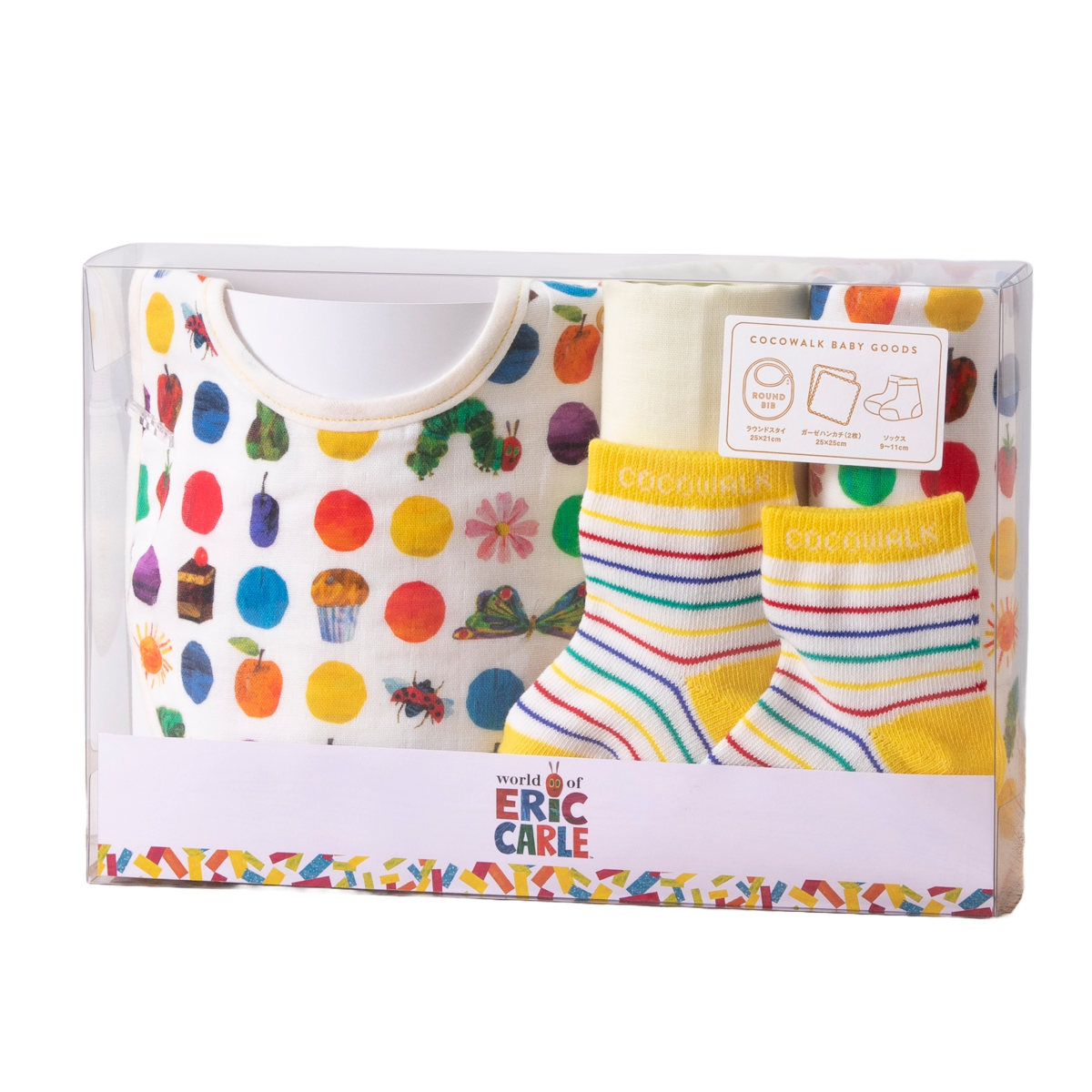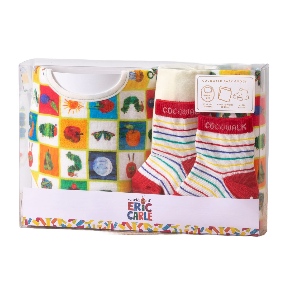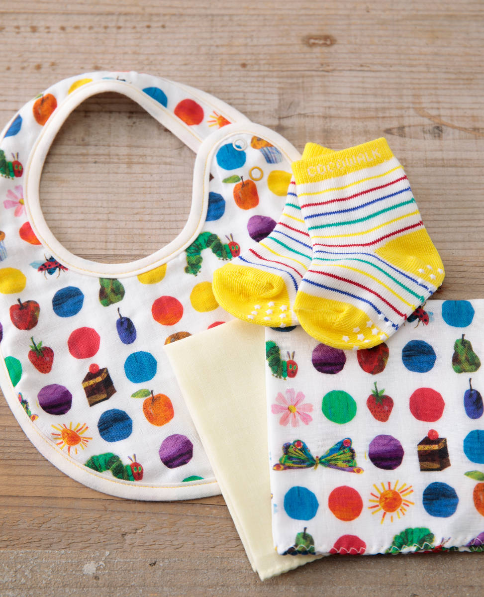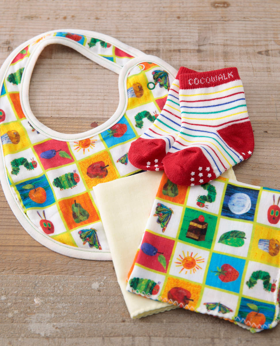 ●人気の絵本はらぺこあおむしがかわいいポップなデザインのスタイ、ハンカチ靴下のギフトセットです。