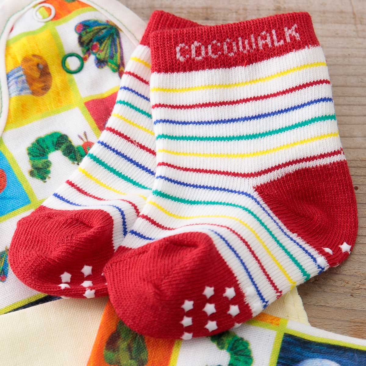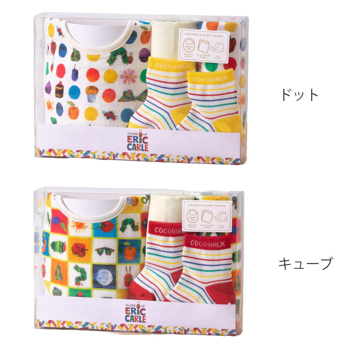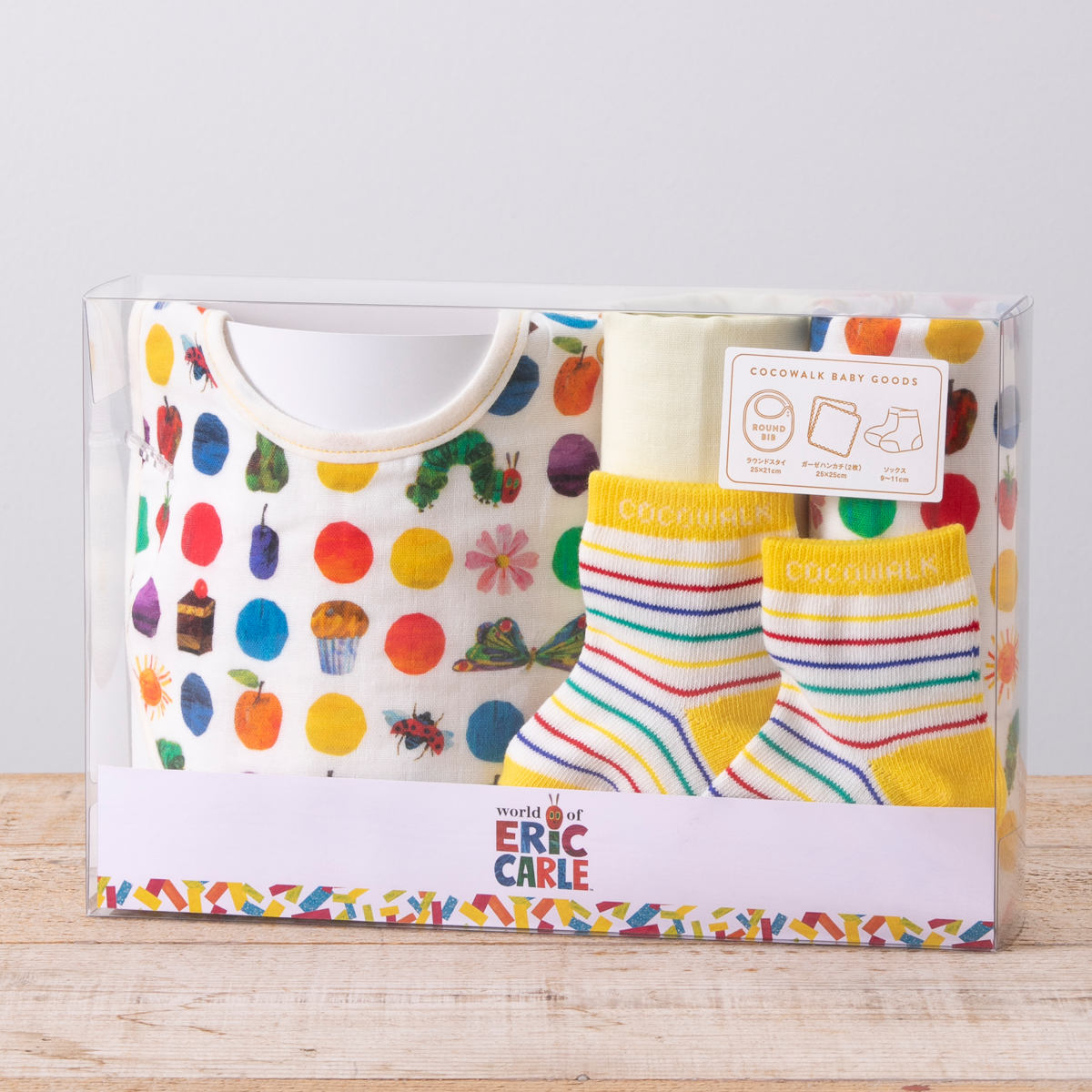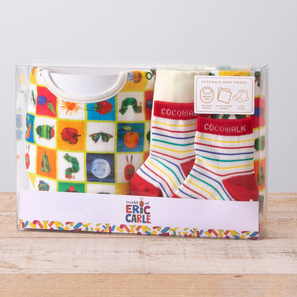 ●人気の絵本はらぺこあおむしがかわいいポップなデザインのスタイ、ハンカチ靴下のギフトセットです。