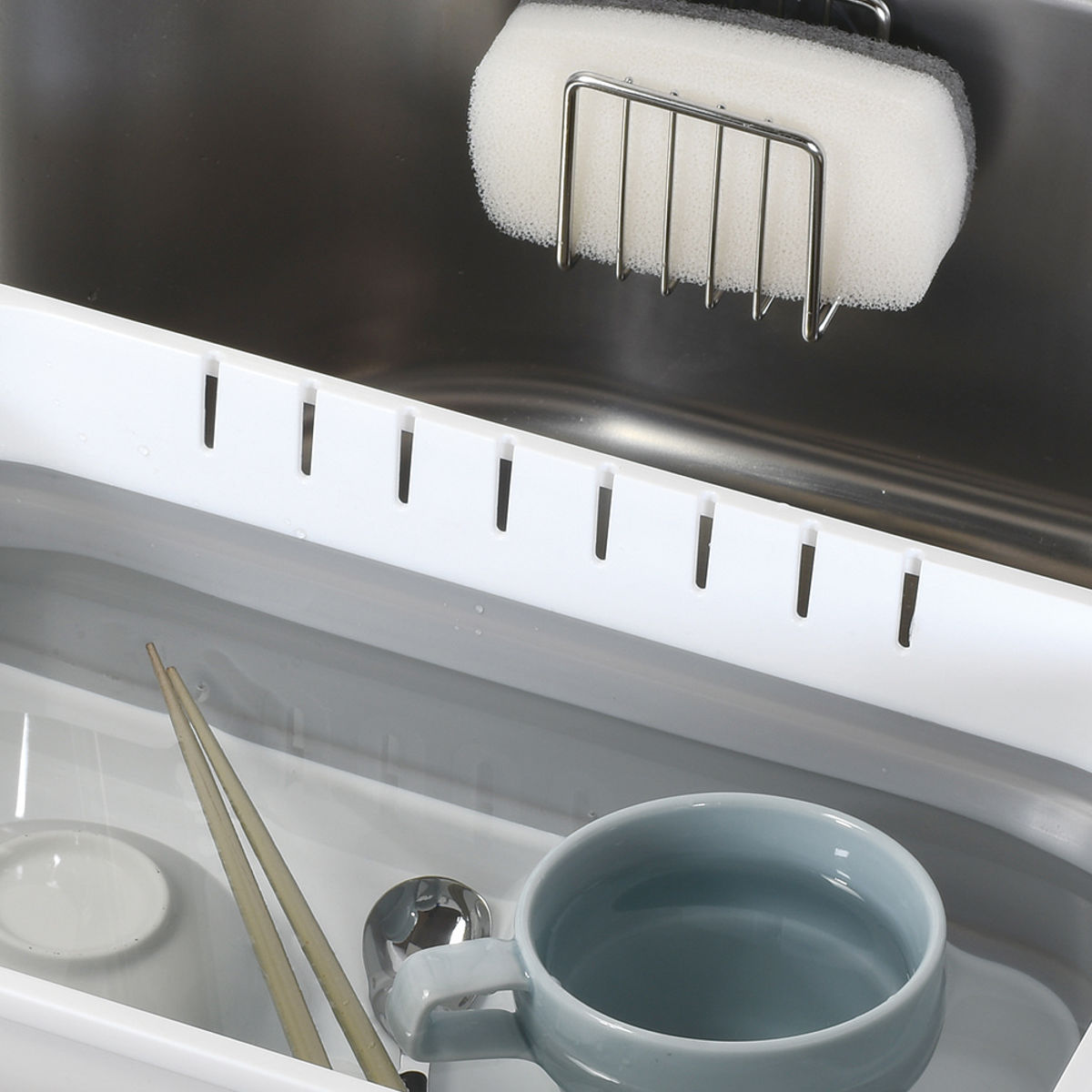 使わない時は折りたたんでコンパクトに収納できます。シンク下などのすき間に収納できるのはもちろん、自立してくれる形状なので、シンク周りに立てておくこともできます。